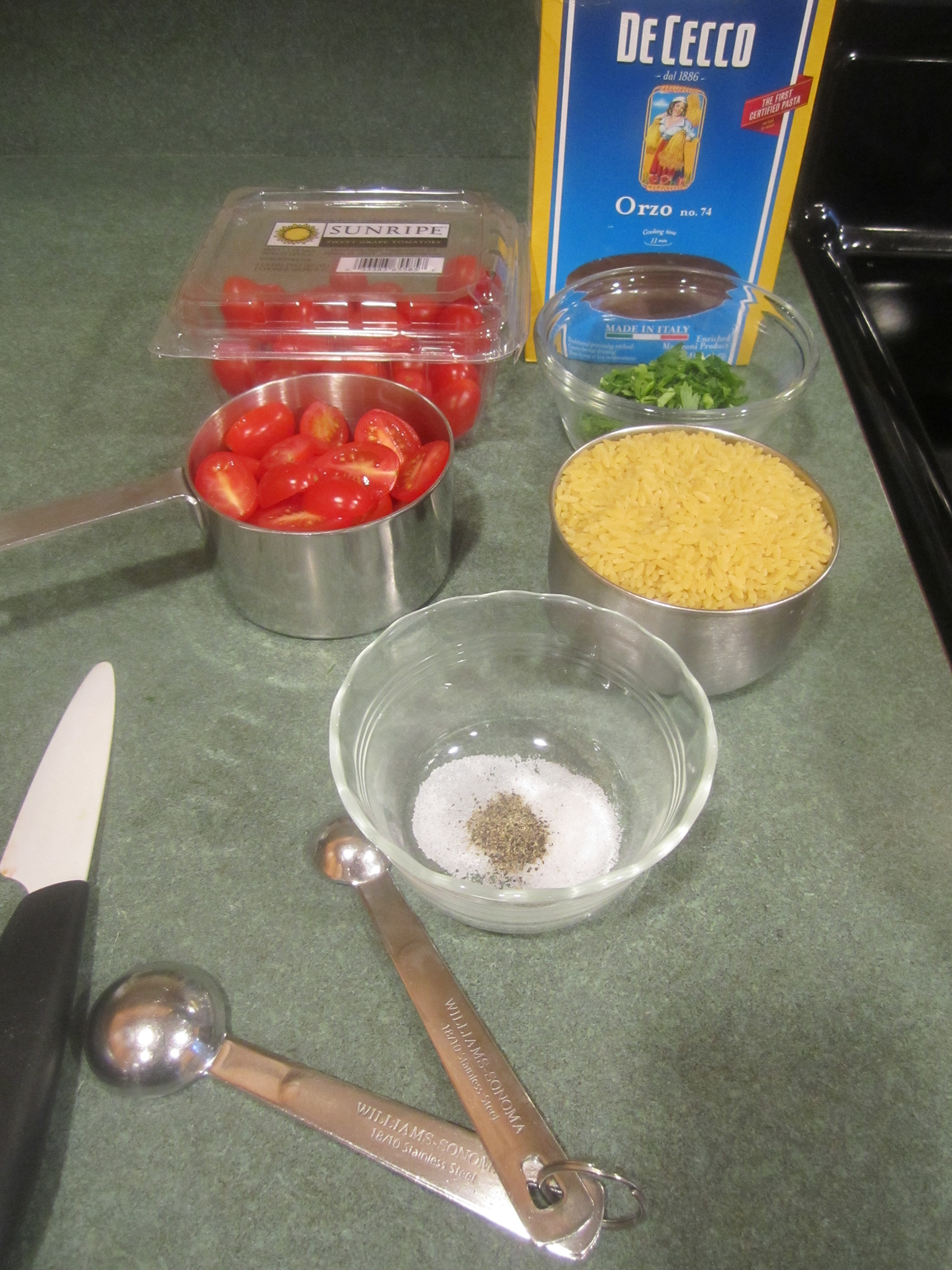 8 ounces uncooked orzo (1-1/2 cups) (I only used 1 cup for the two of us, leaving me with plenty of leftovers)
