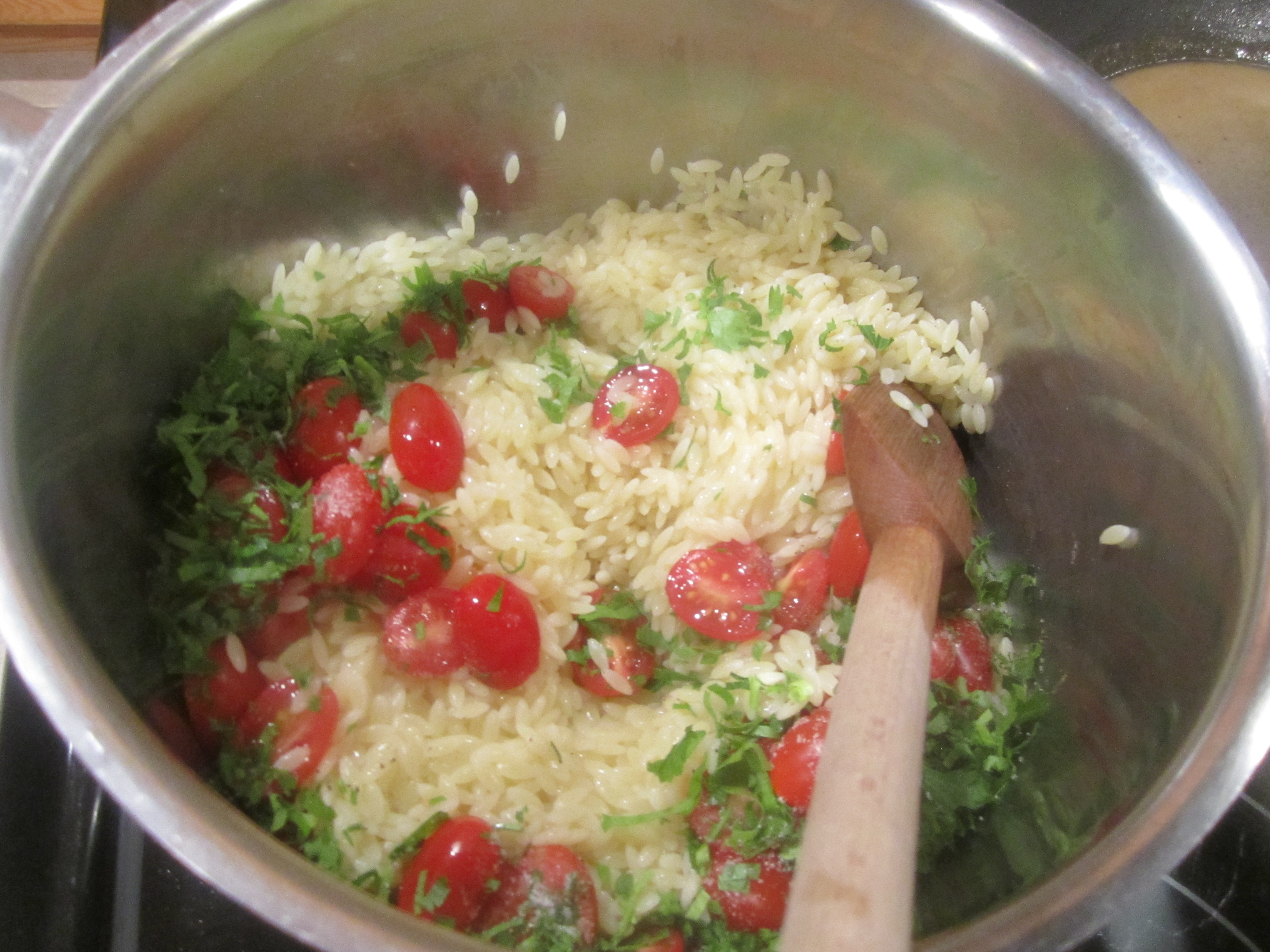 When the water comes to a boil, add your orzo, omitting salt and fat, cooking for 11 minutes, or whatever the directions on the box says.