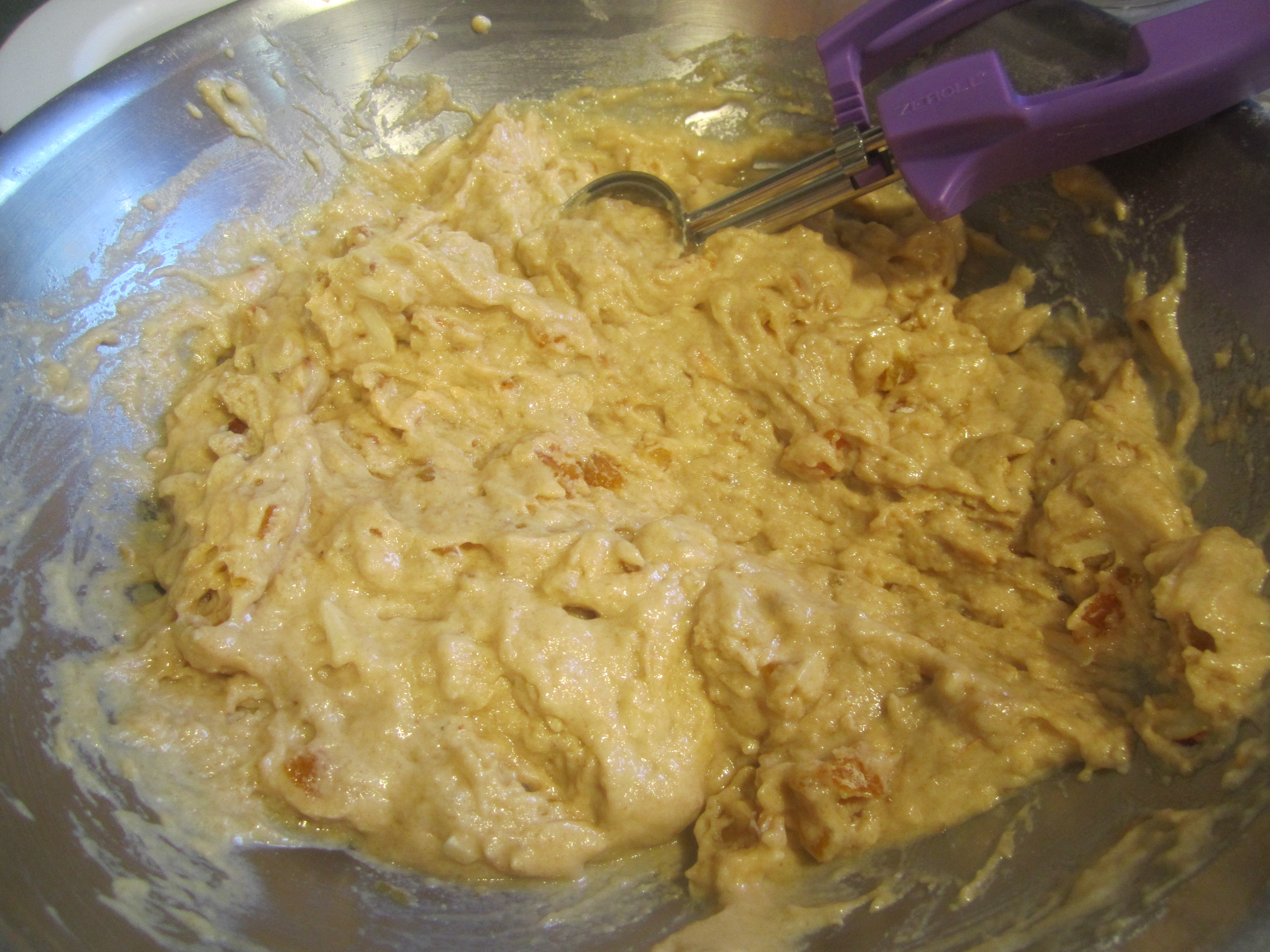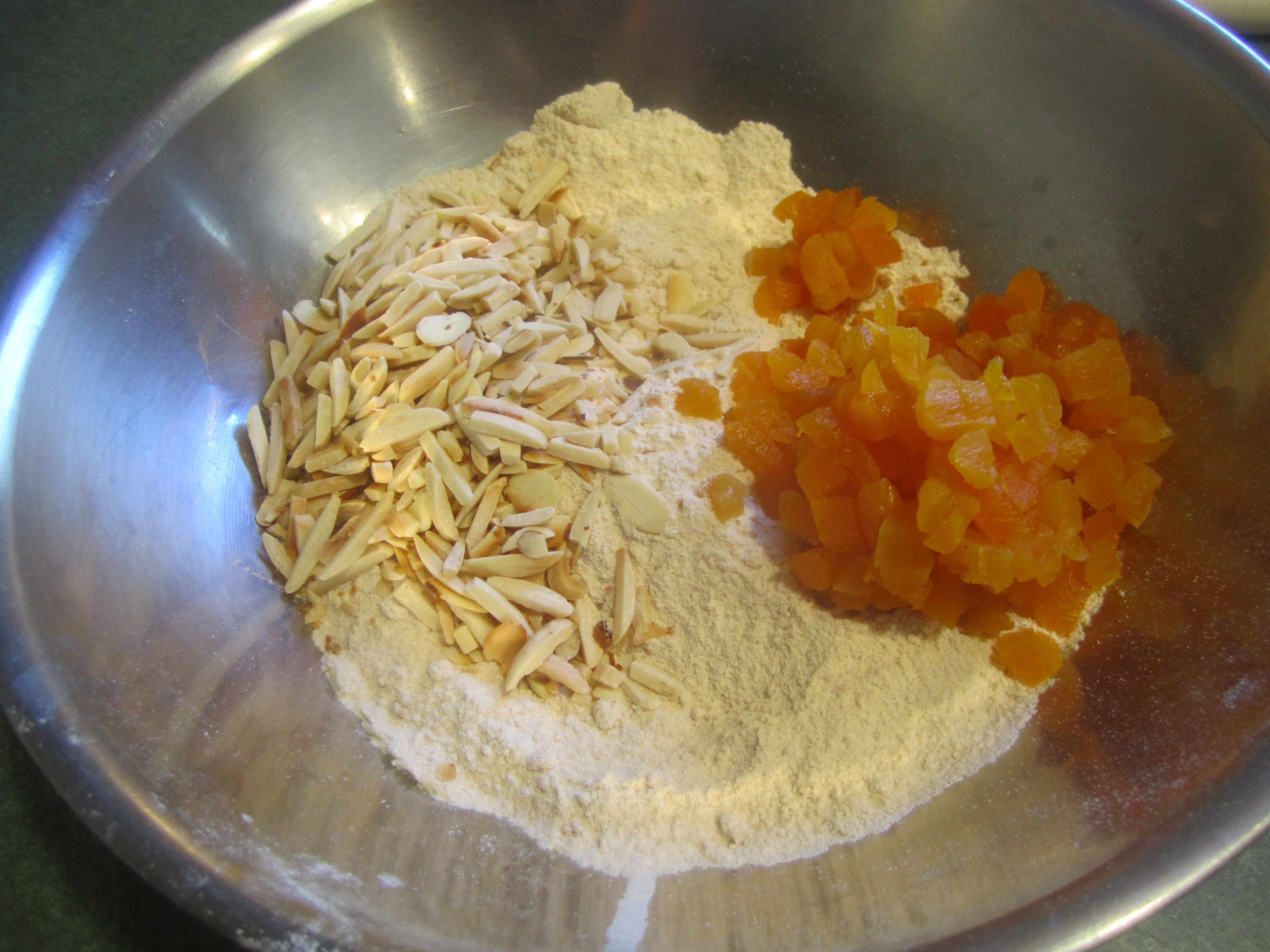 In a large bowl place the flour, sugars, baking powder & soda and salt. Stir together with a whisk. Add the diced apricots and almonds and stir together completely with the flour mixture, using a rubber spatula. Combine sour cream or buttermilk, vegetable oil, eggs, vanilla and almond extracts in 2 cup glass measuring cup and stir together with a whisk. Fold into the dry ingredients until just combined.