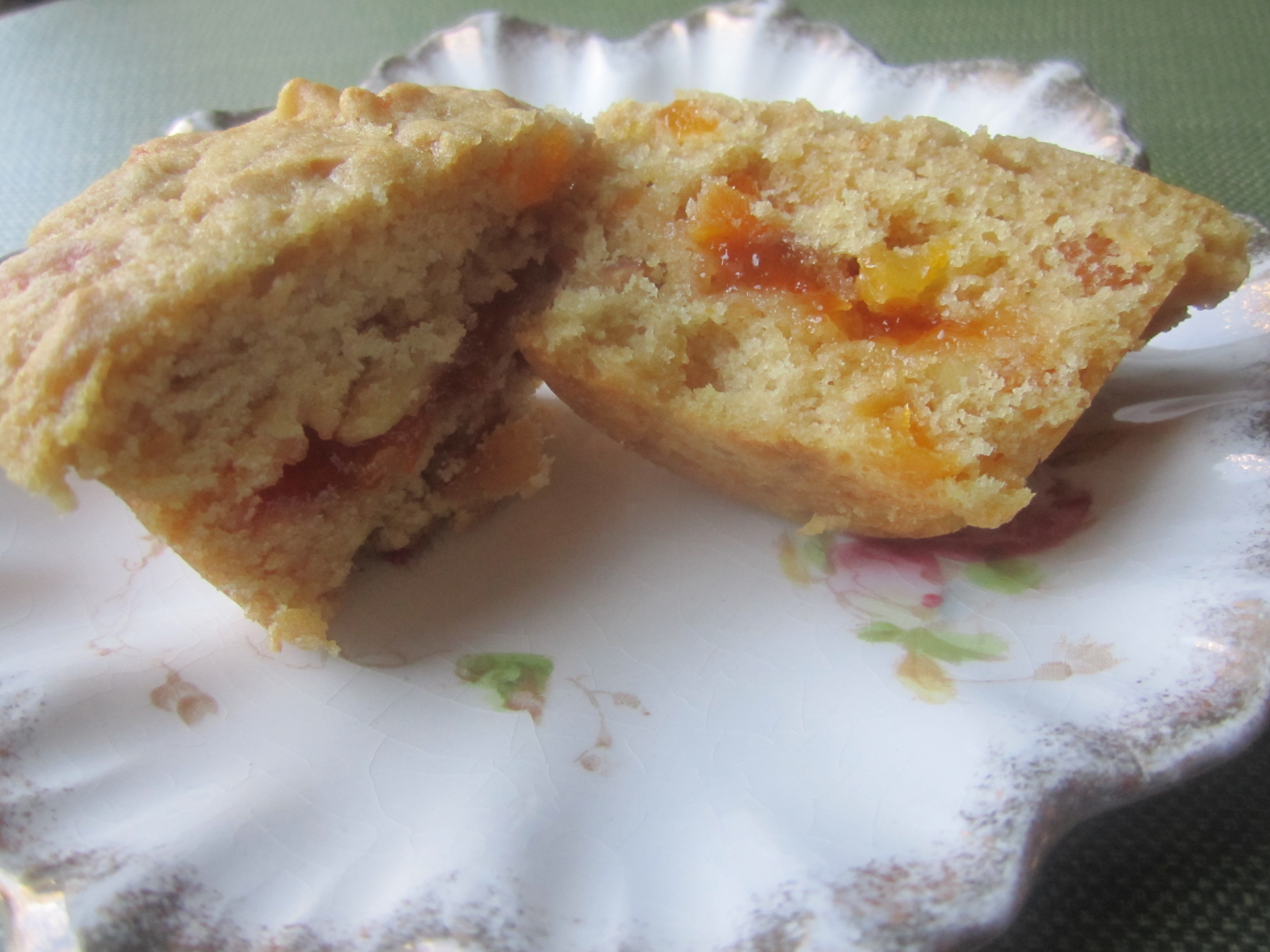 Place about 2 tablespoons of batter into each muffin cup. Place about a 1/2 teaspoon of apricot preserves in the center of the batter. Place another 2 tablespoons of batter on top.