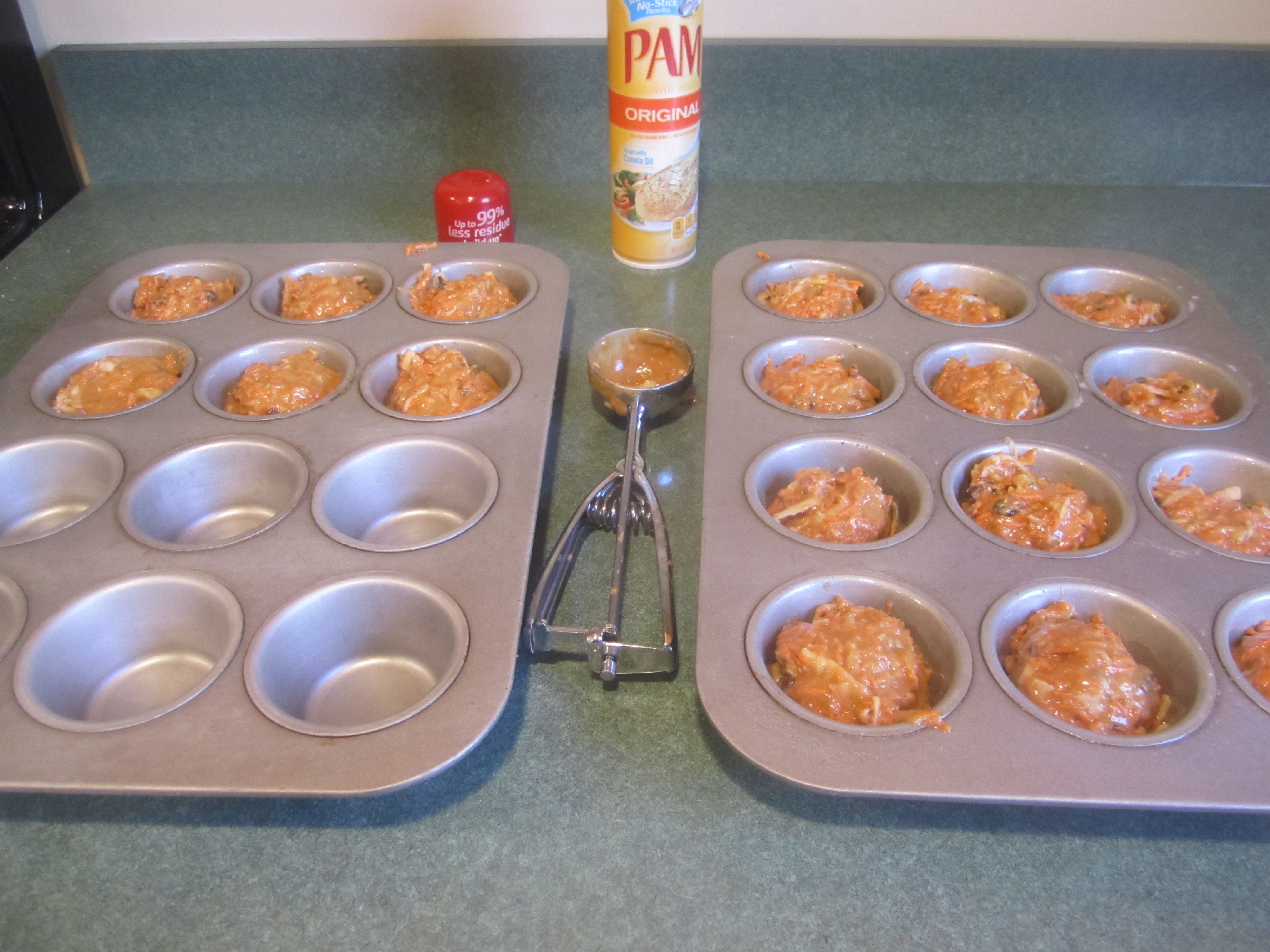 Preheat oven to 350 degrees.  Spray a 12 cup muffin tin and 6 cups of another 12 cup muffin tin, with canola oil spray.