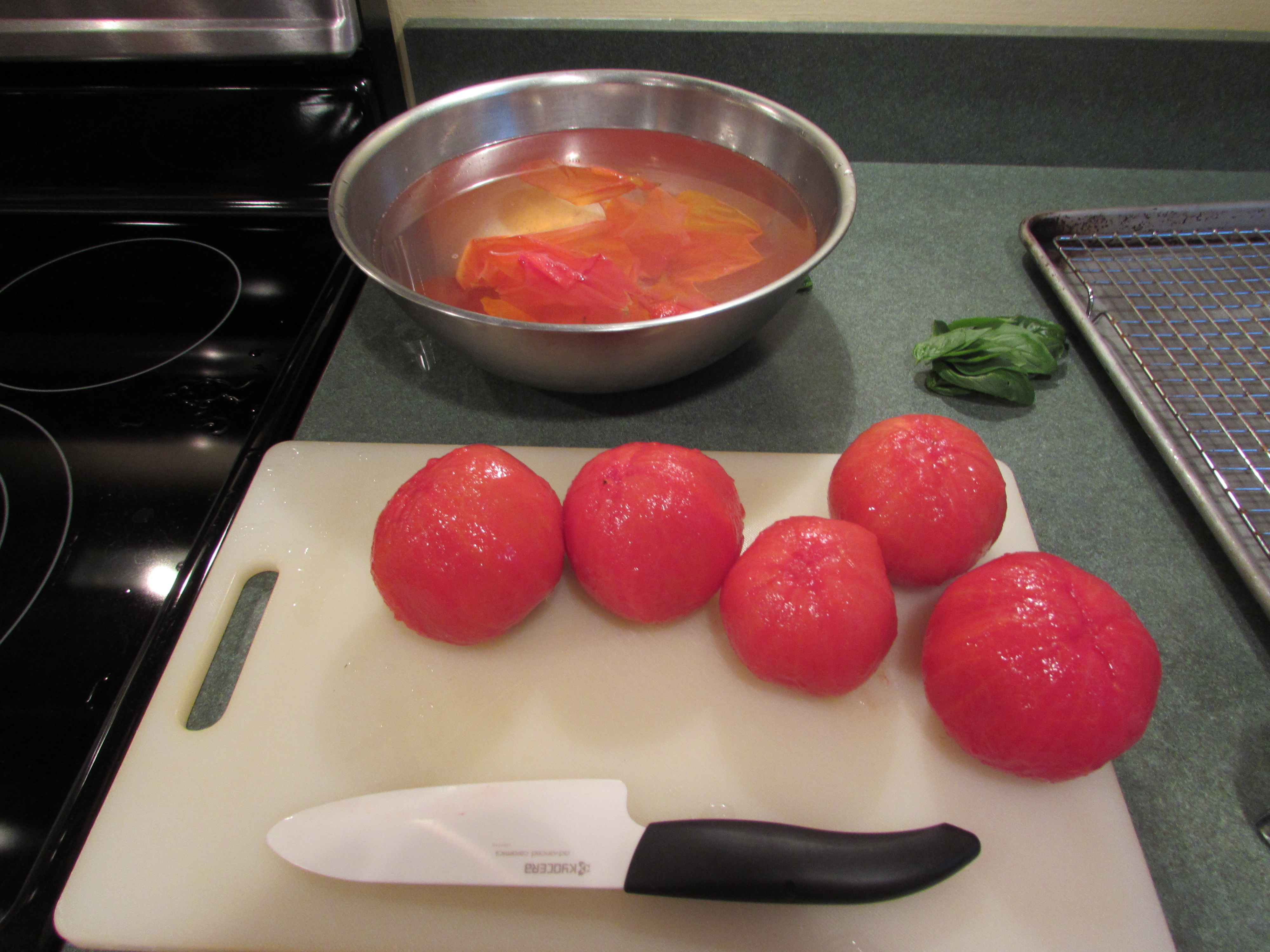 When the water comes to a boil, gently place the tomatoes into the water.  After about 30 seconds the skin will start peeling off the tomato.  When this happens, with a slotted spoon, remove the tomatoes into the ice water.