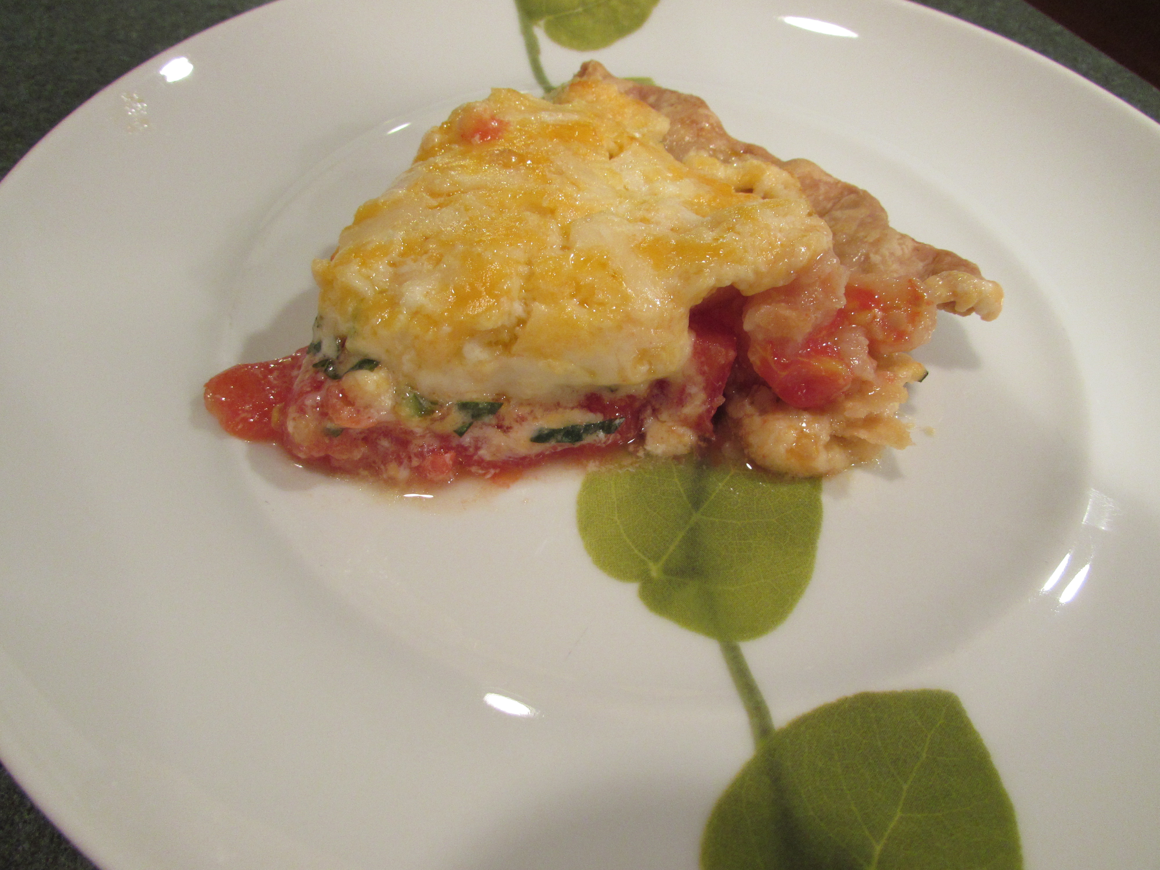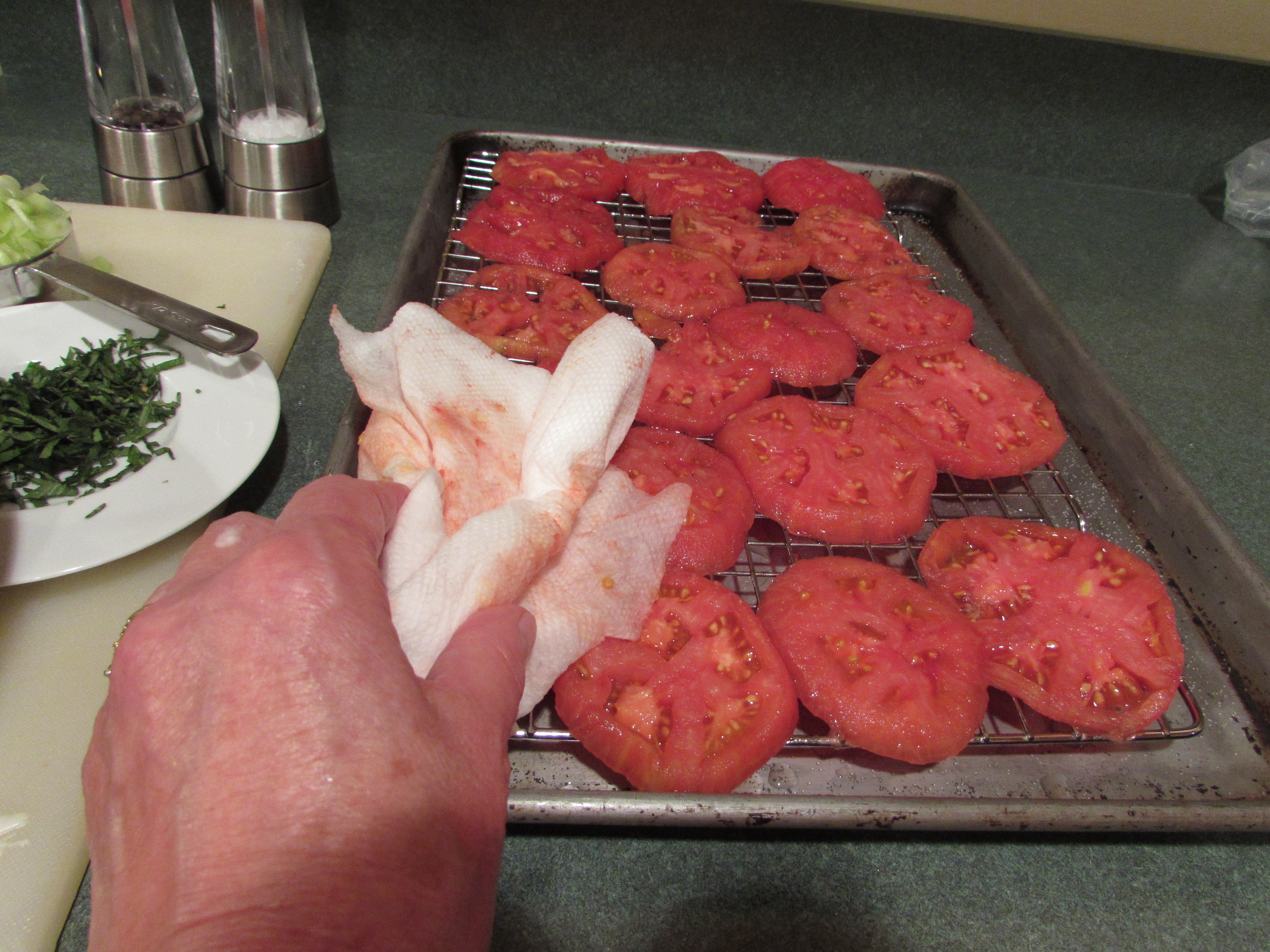 Assemble pie:  pat the tomatoes carefully with paper towels while still on the cookie cooling rack.  Then take each slice, place it on a paper towel, and fold the paper towel over the tomato, absorbing more juice from the tomato.