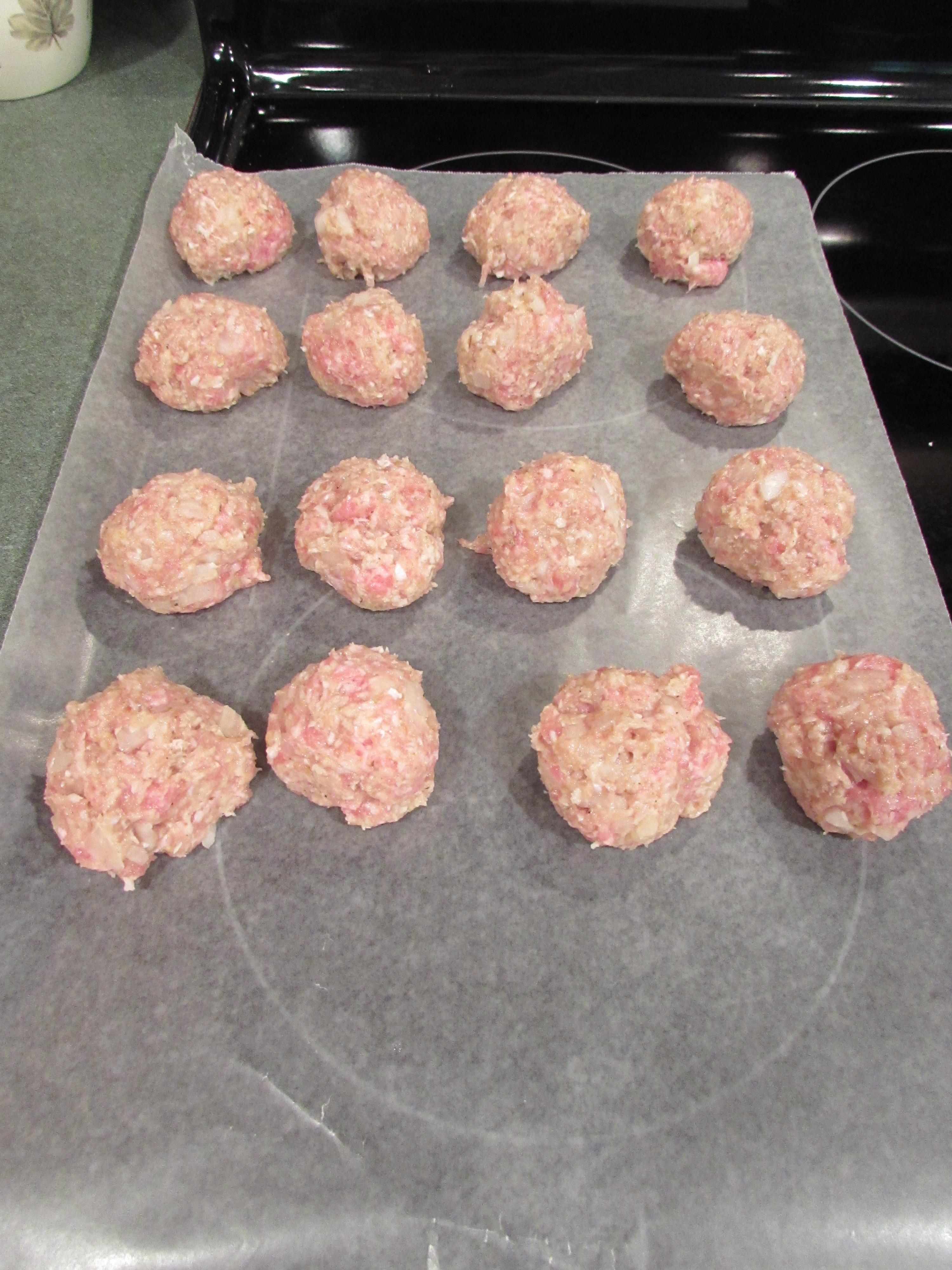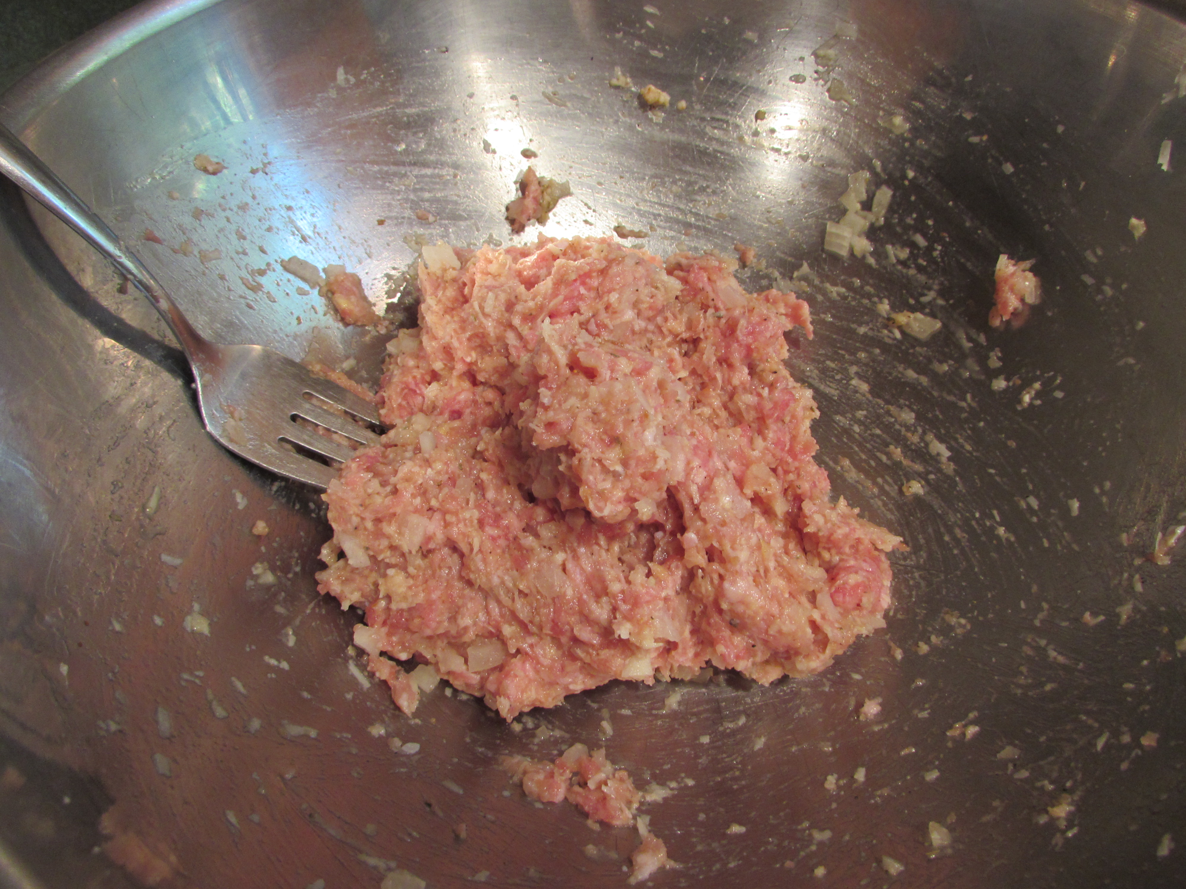 In a large bowl, add the egg, 1/4 cup water, 1 teaspoon salt, 1/4 teaspoon pepper, half the onion, half the garlic, breadcrumbs, cheese, pork, turkey and 1/2 teaspoon Italian seasoning. Mix gently with a very large fork. Form into 16 meatballs (an ice cream scoop comes in handy here, for making the meatballs).