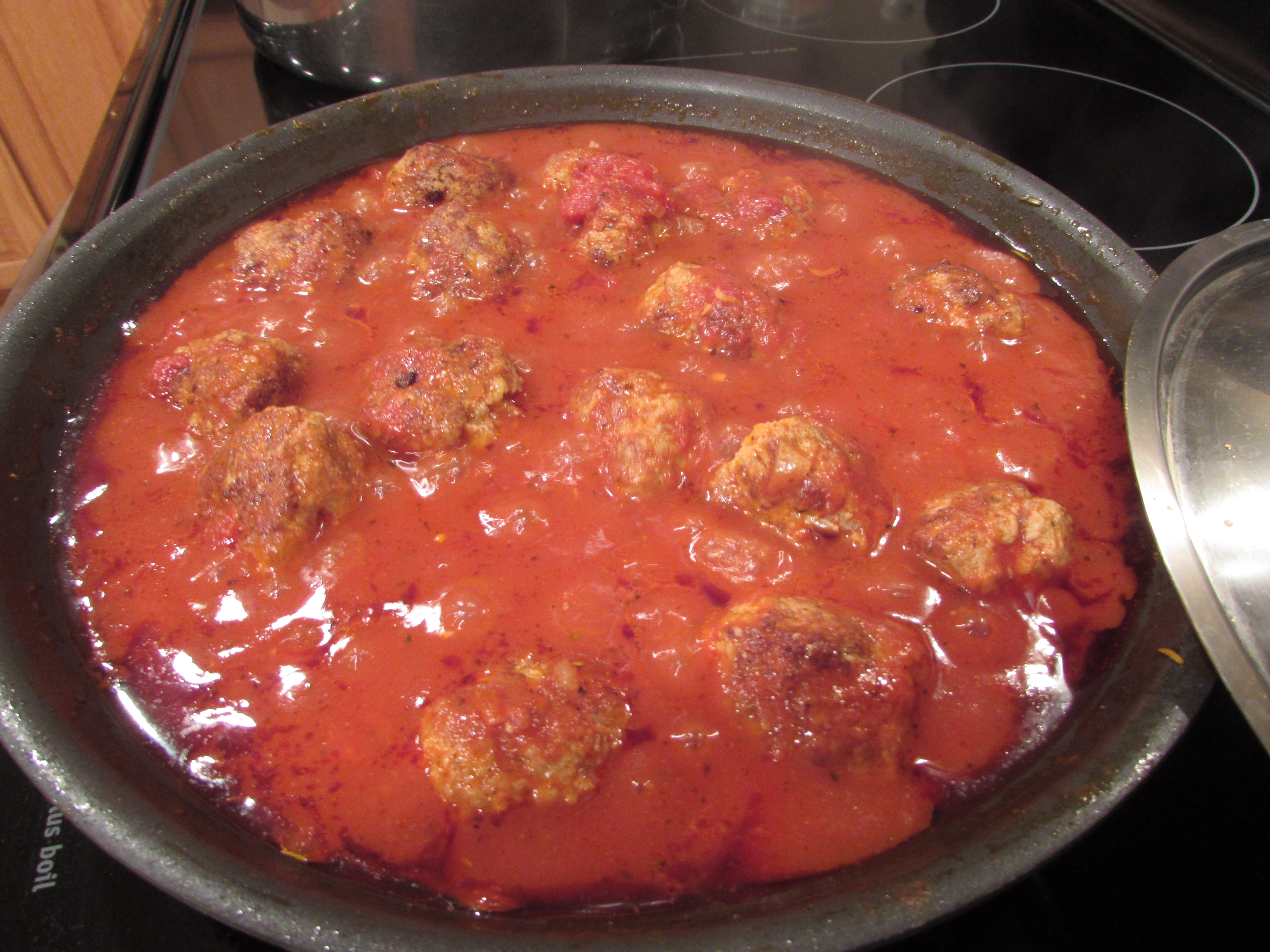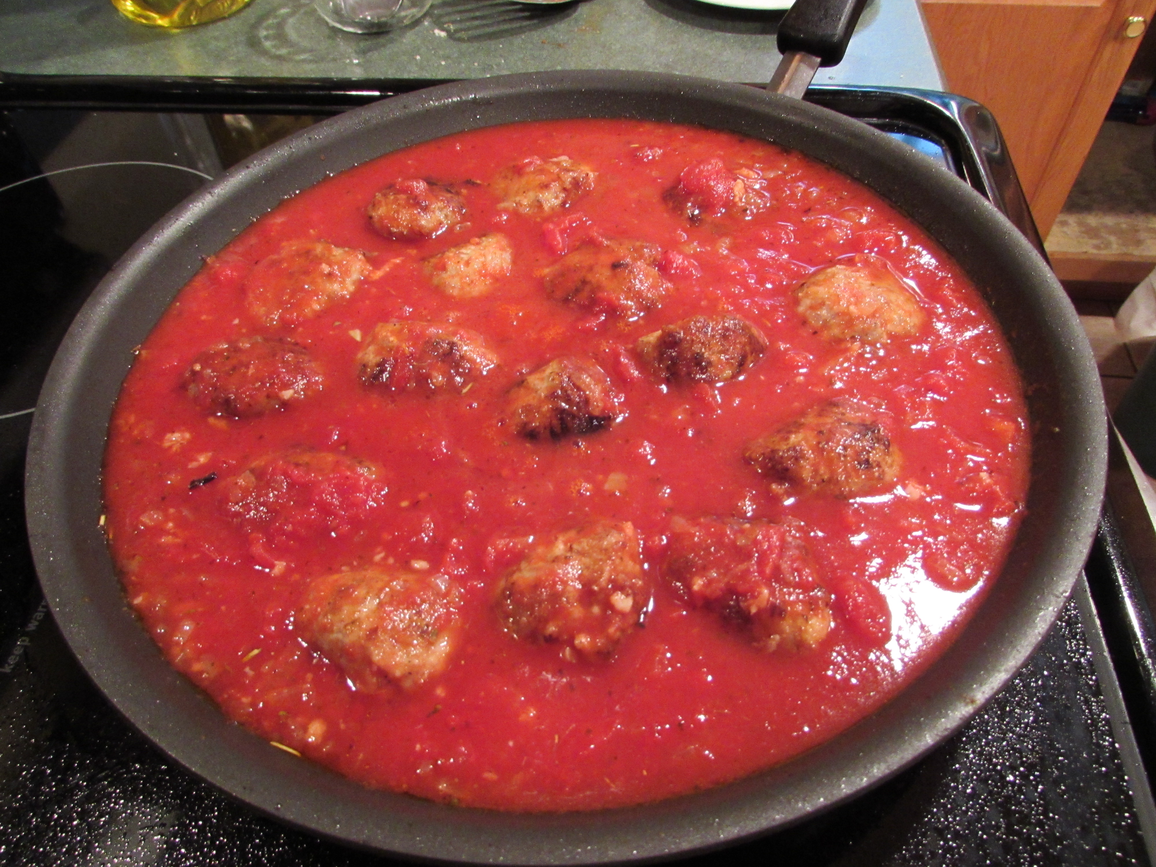Heat 1 tablespoon oil in a large non-stick skillet over medium high heat. Add half the meatballs and brown on all sides, 4-6 minutes total and turning every minute or so. Transfer to a plate. Add 1 tablespoon of oil, and cook remaining meatballs. Set aside on plate.
