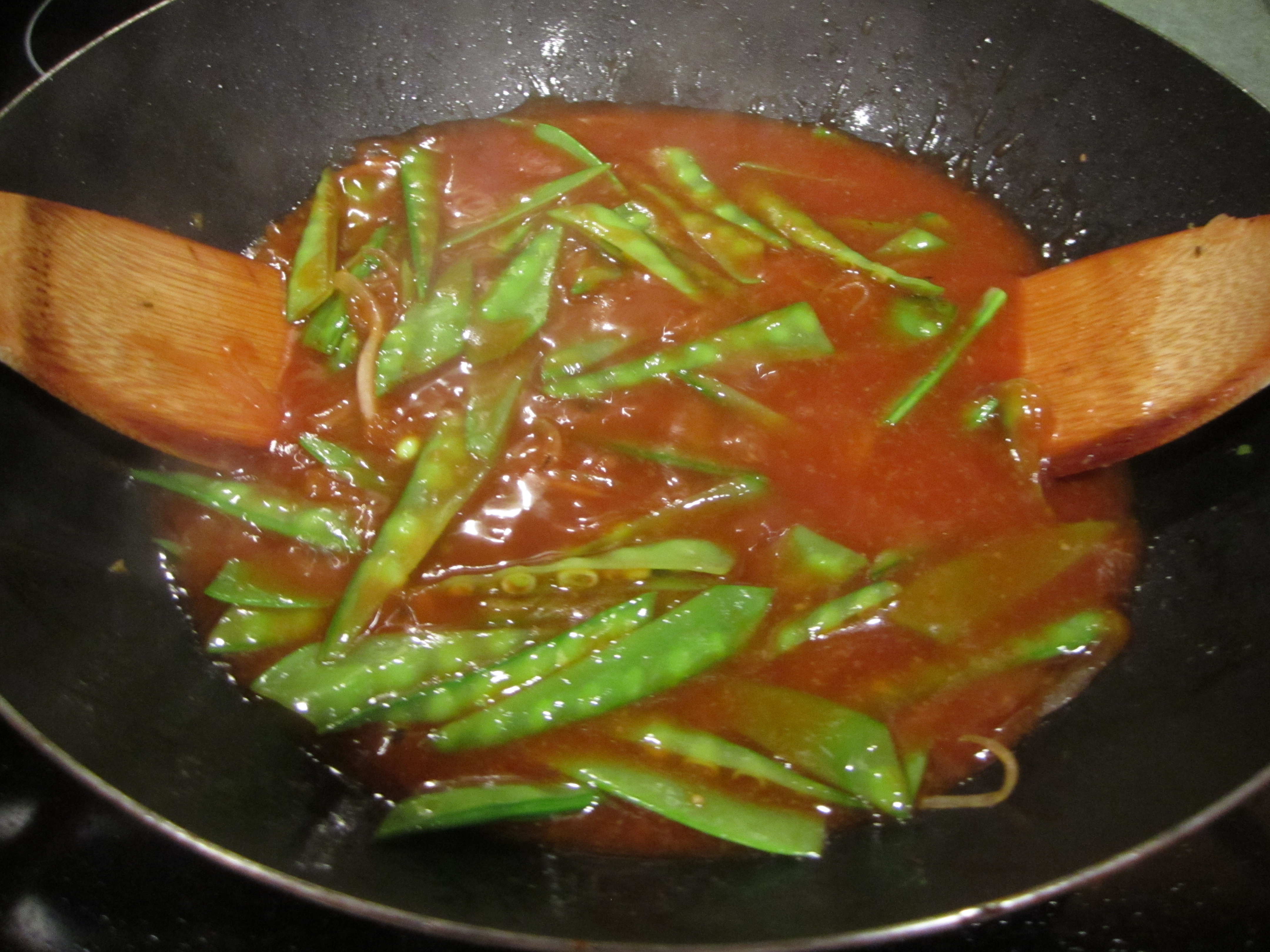 add snow peas and onion to pan and cook:
