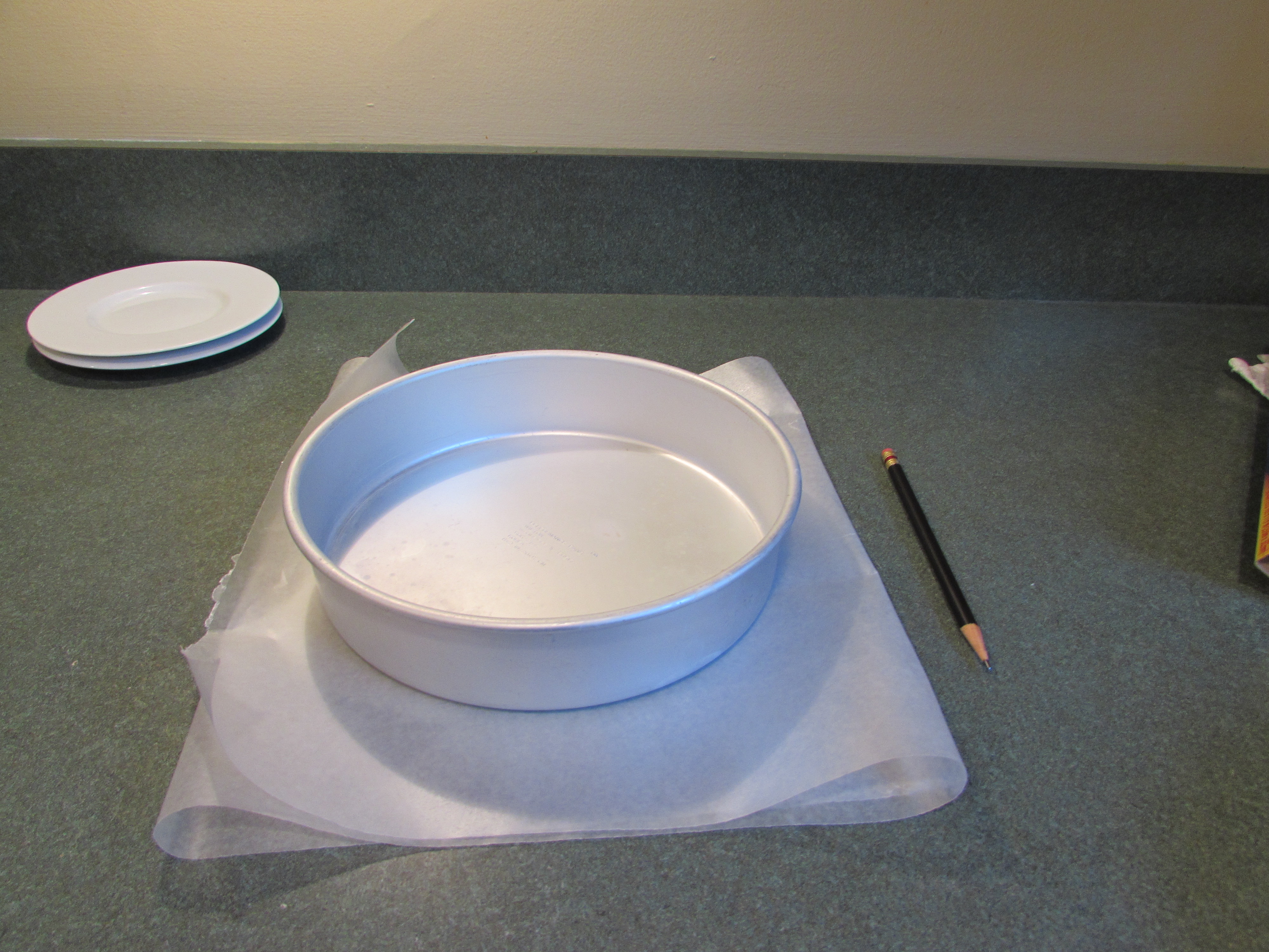 prepping pans with rounds of wax paper and spraying with Pam Baking Spray:
