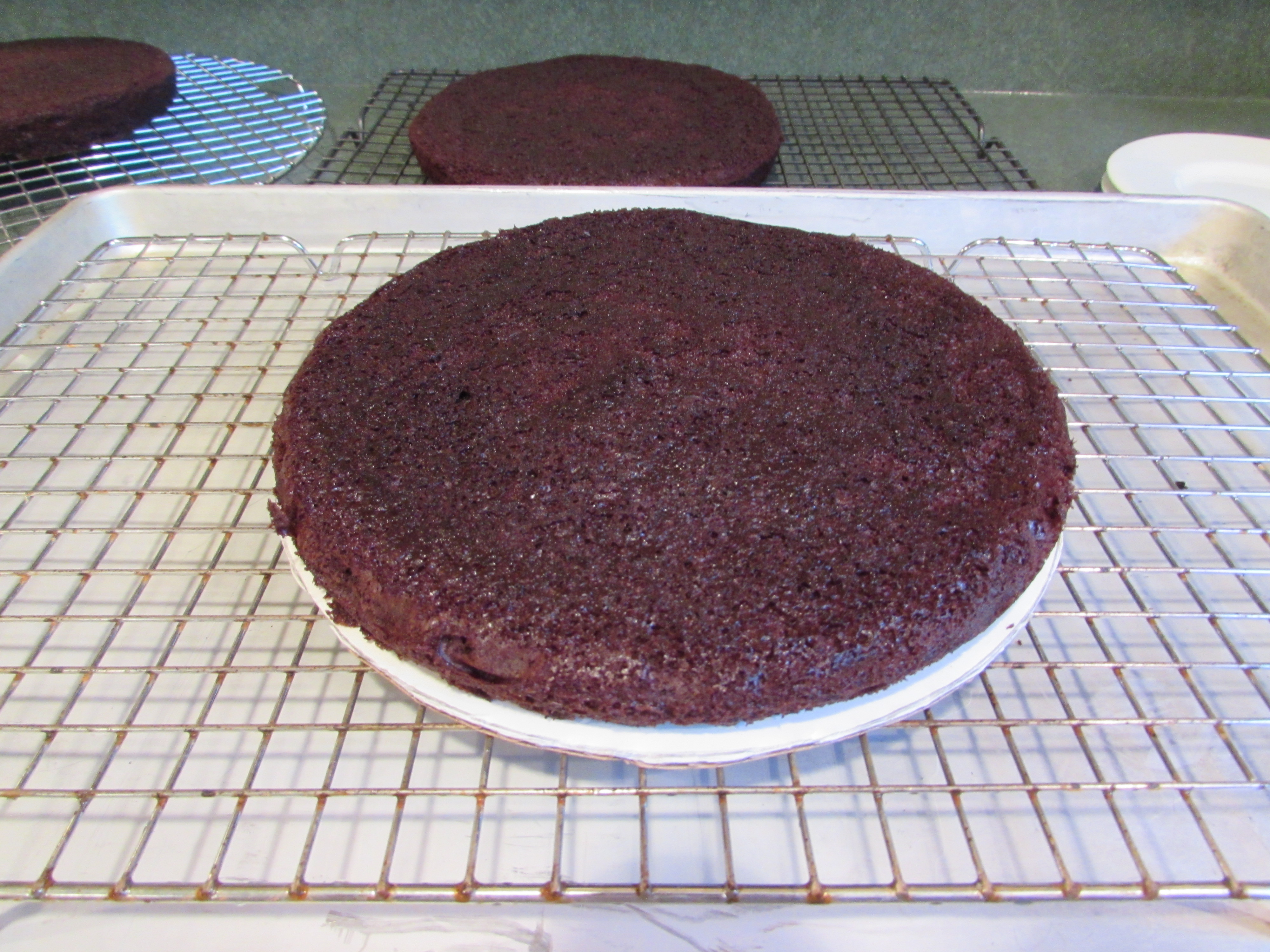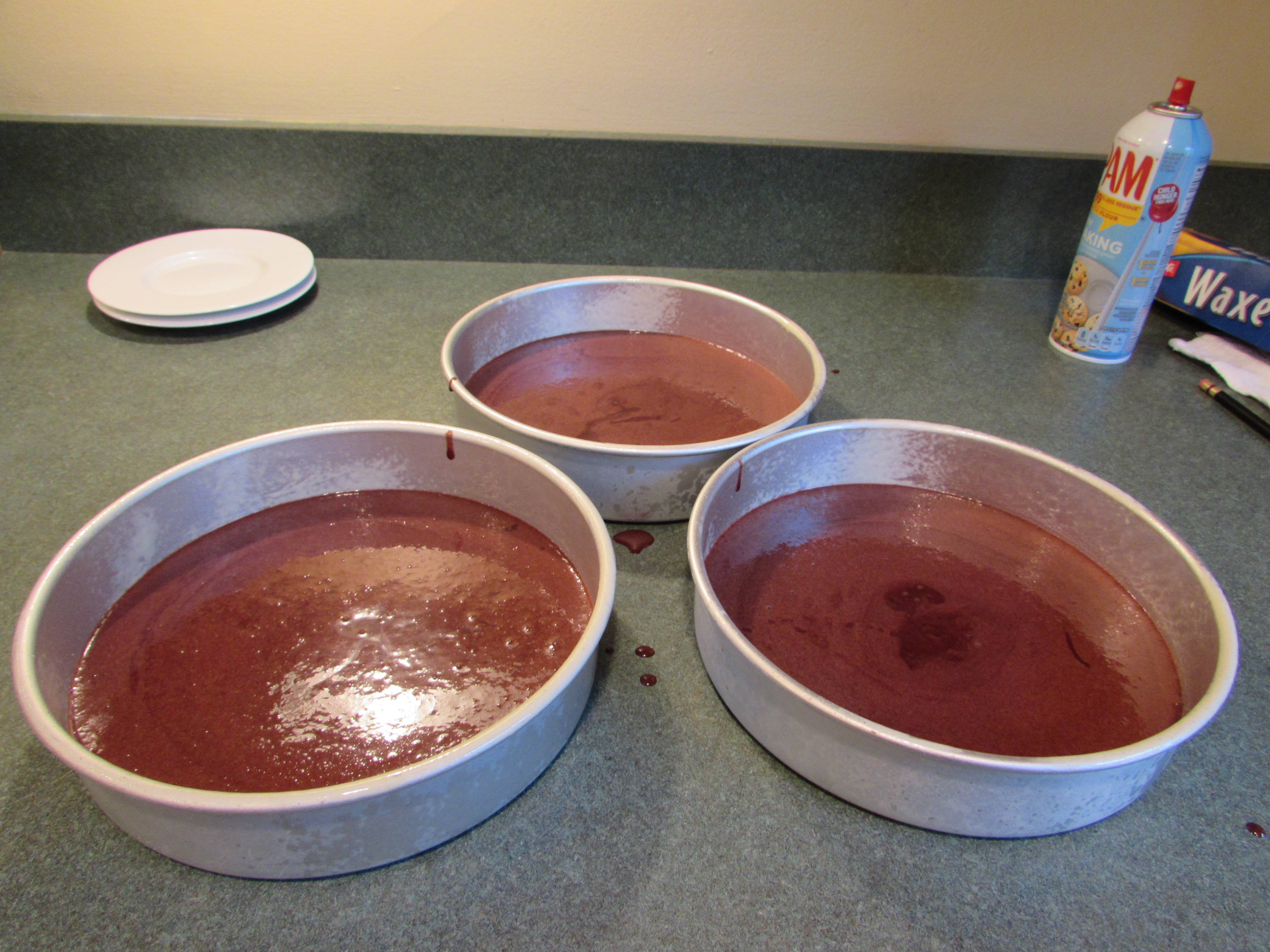 Cut out 3, wax paper rounds using the 8 inch round cake pan as your guide. Spray cake pans with Pam Baking spray, place wax paper round on bottom and spray bottom of pans with Pam Baking spray. Set aside.