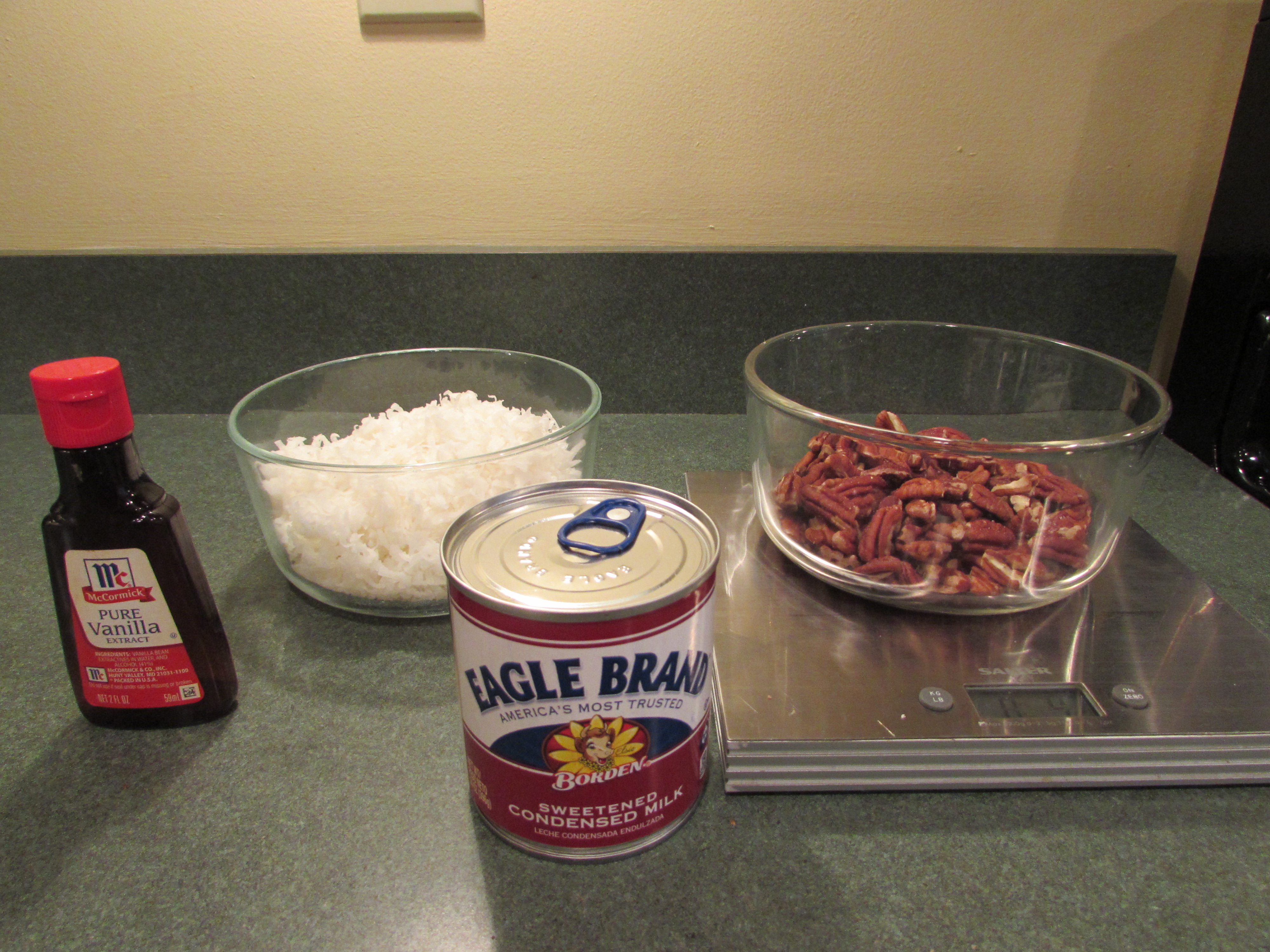 Pour condensed milk into a 9 inch glass deep dish pie plate and cover tightly with aluminum foil. Place dish in a large roasting pan. Pour water into roasting pan half way up pie plate. Place in oven and bake for 45 minutes. After 45 minutes, check to see if you need more water and if you do, pour more in so that it is half way up pie plate. Bake for another 30 minutes. The milk should be brown and thick. Remove from oven and take pie plate out of roasting pan. Take aluminum foil off and stir in pecans, coconut and vanilla. Set aside.