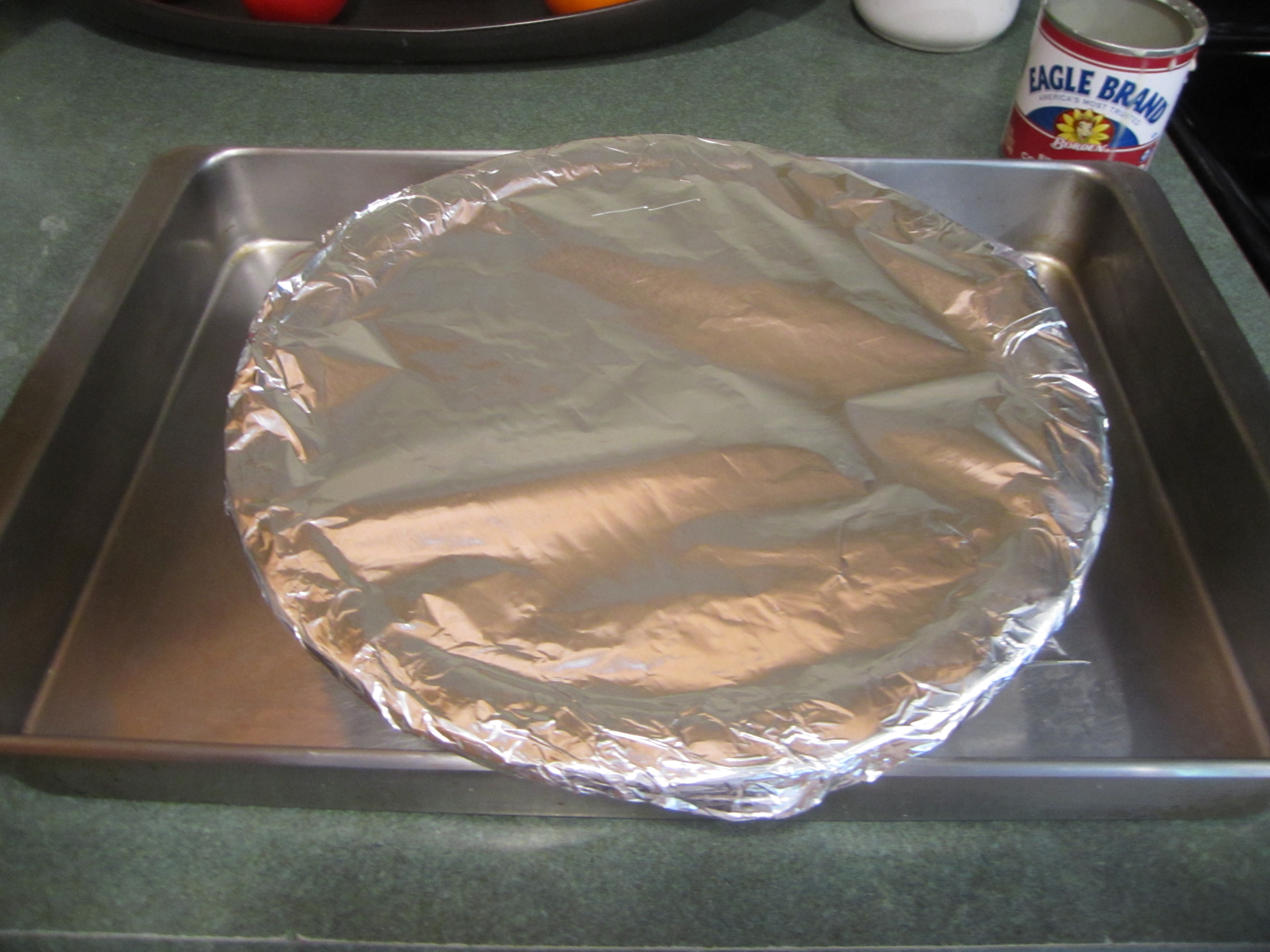 sweetened condensed milk in pie plate, covered and into the roasting pan: