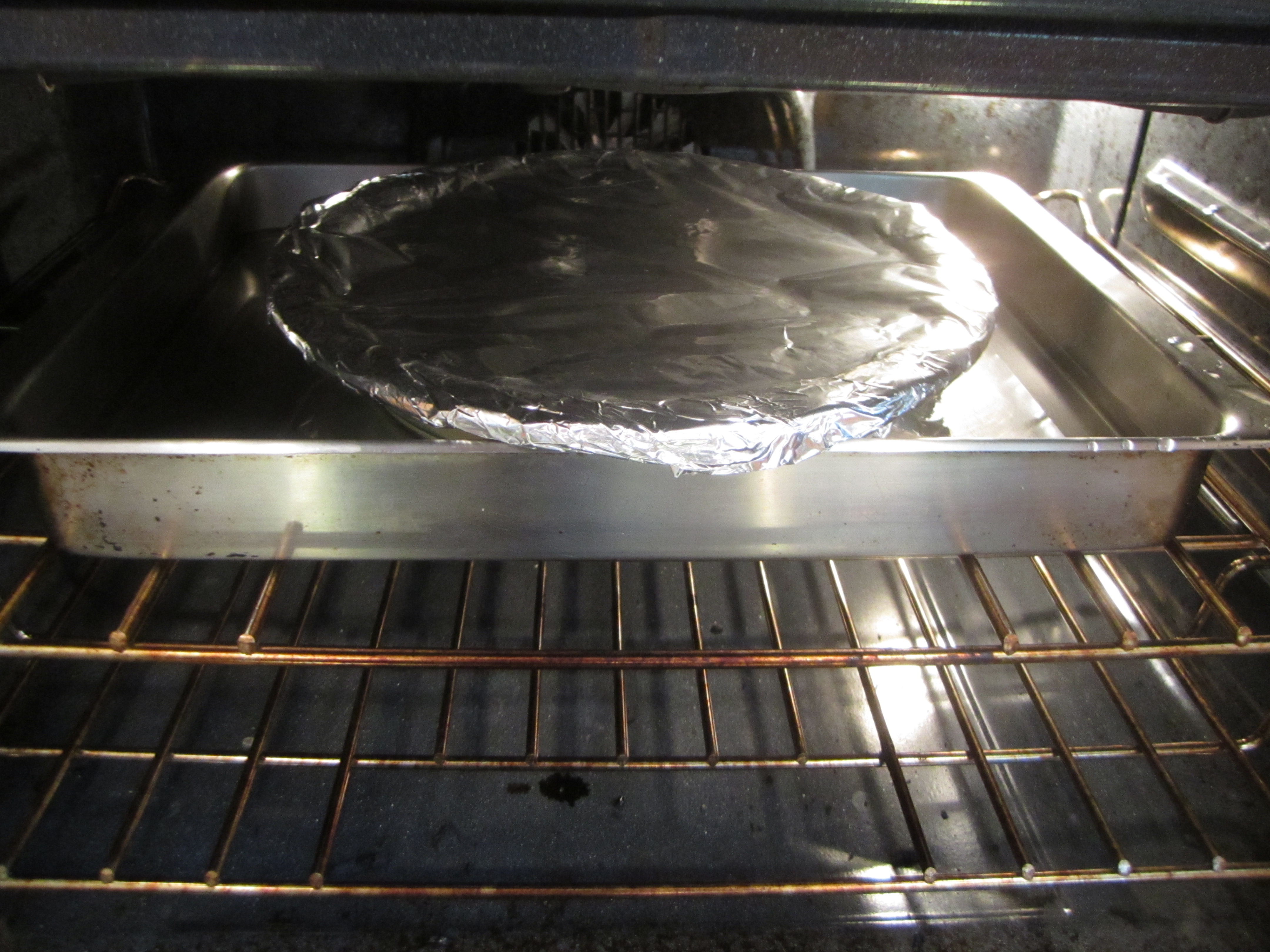 let sit for awhile and then transfer to a plate (or in this case a cake caddy bottom because I am taking it to a party, later that evening), cover and place in refrigerator for at least 1 hour: