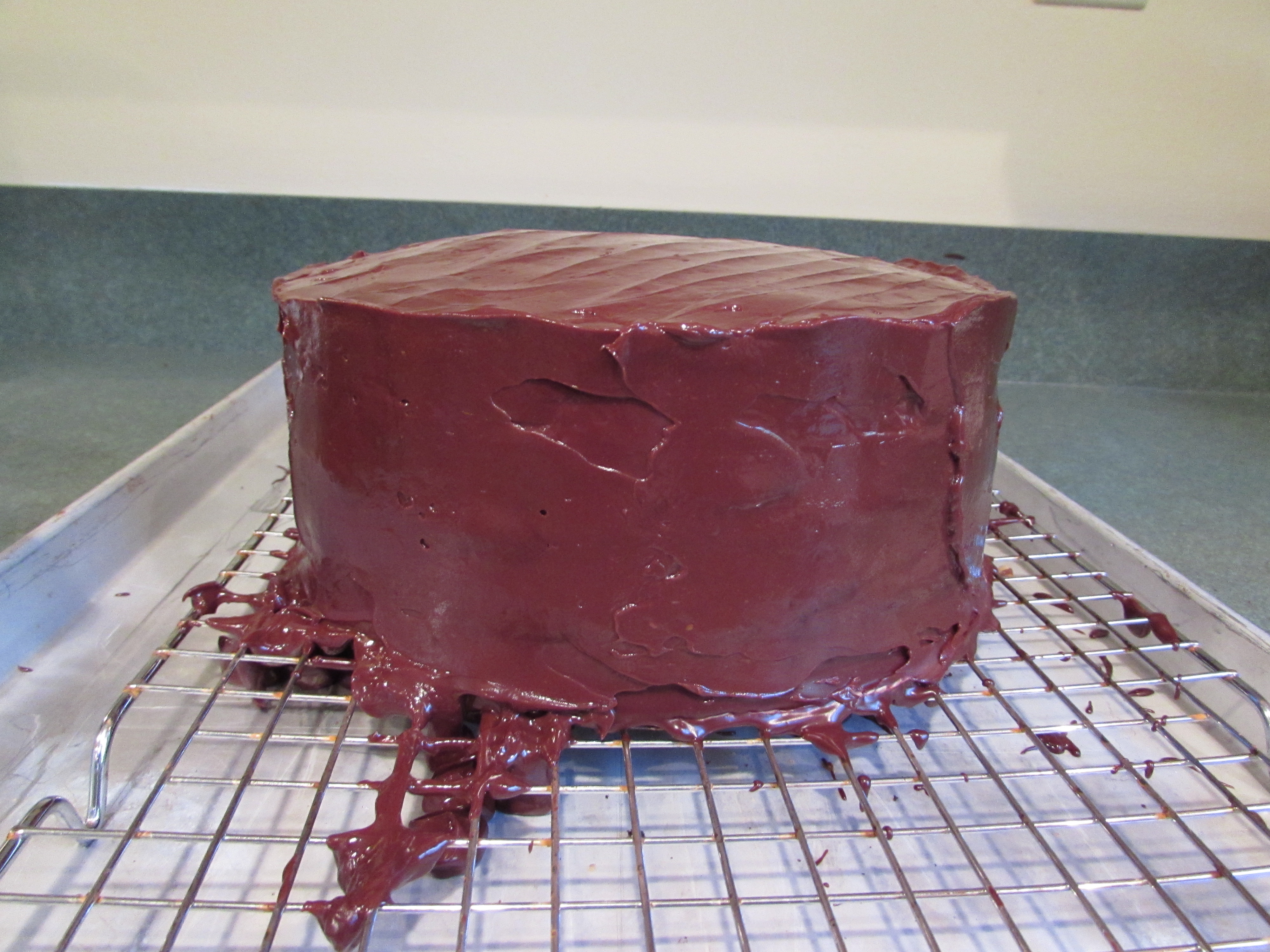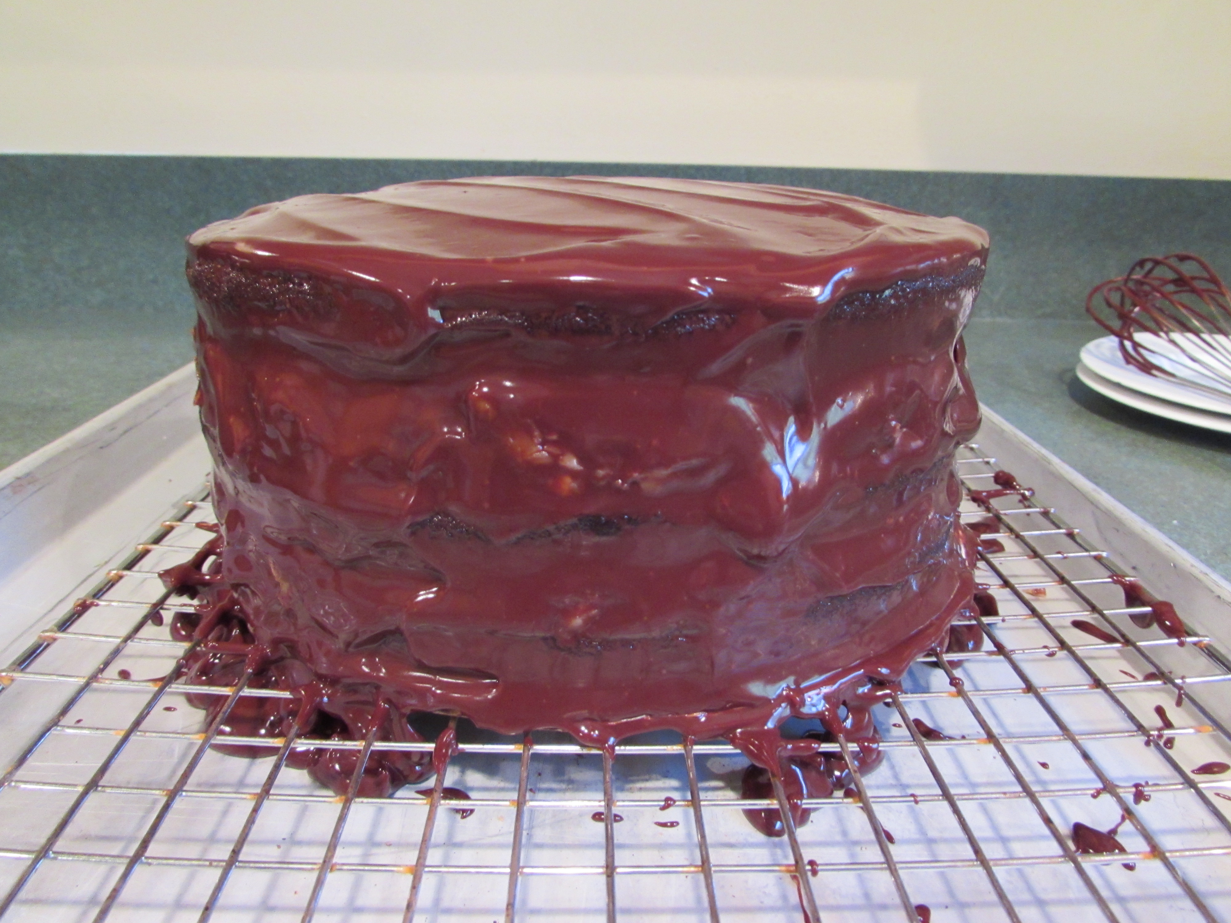 Slowly pour glaze over cake, smoothing the glaze over the cake using a large icing spatula. Do this in stages so that the glaze sets somewhat, making a nice layer over the cake. Let the cake sit for a half hour or so.