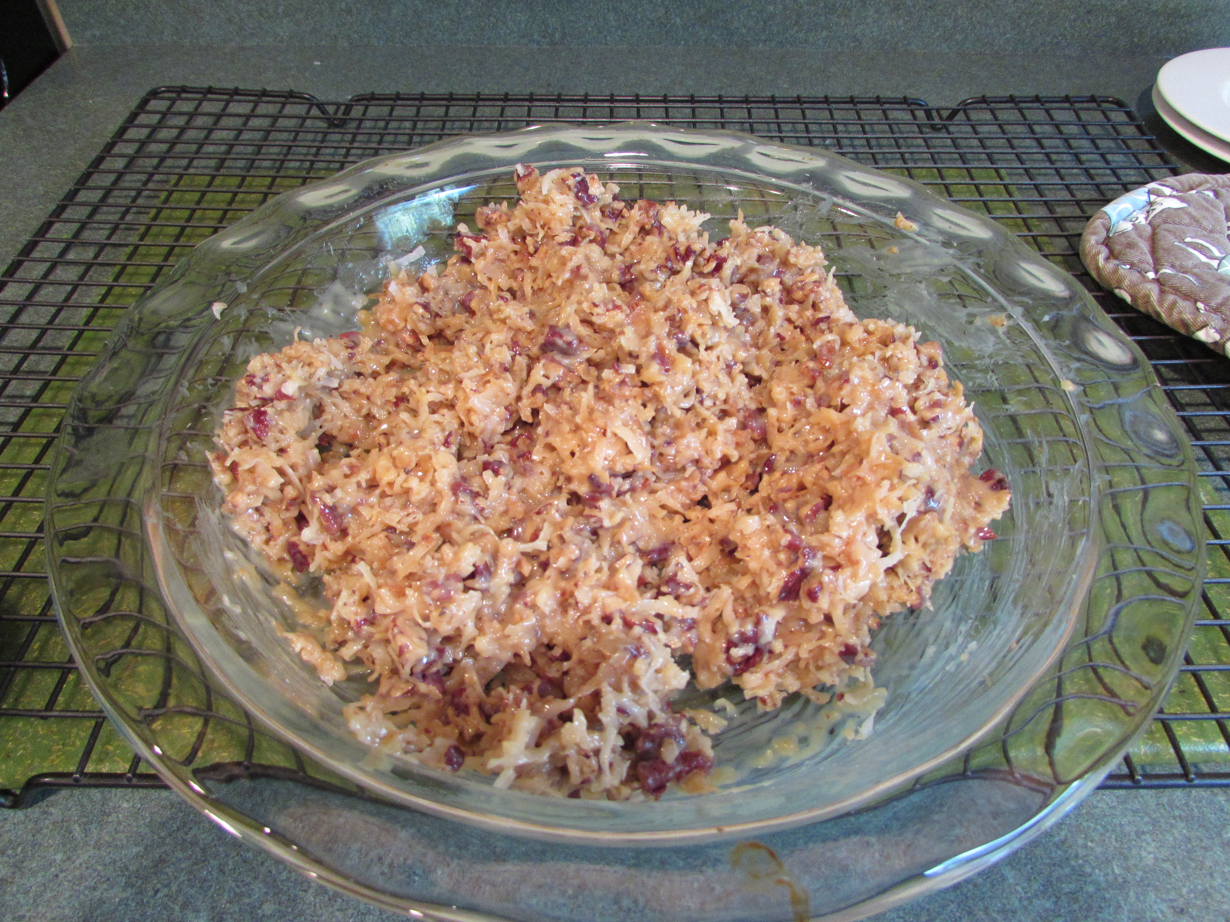 Spread coconut in a medium shallow baking pan and pecans in a small shallow baking pan. Place coconut and pecans in oven, for 12 – 16 minutes. Stir halfway through and then after 12 minutes, stir every minute for the next 3-4 minutes, until golden brown. Set aside to cool.