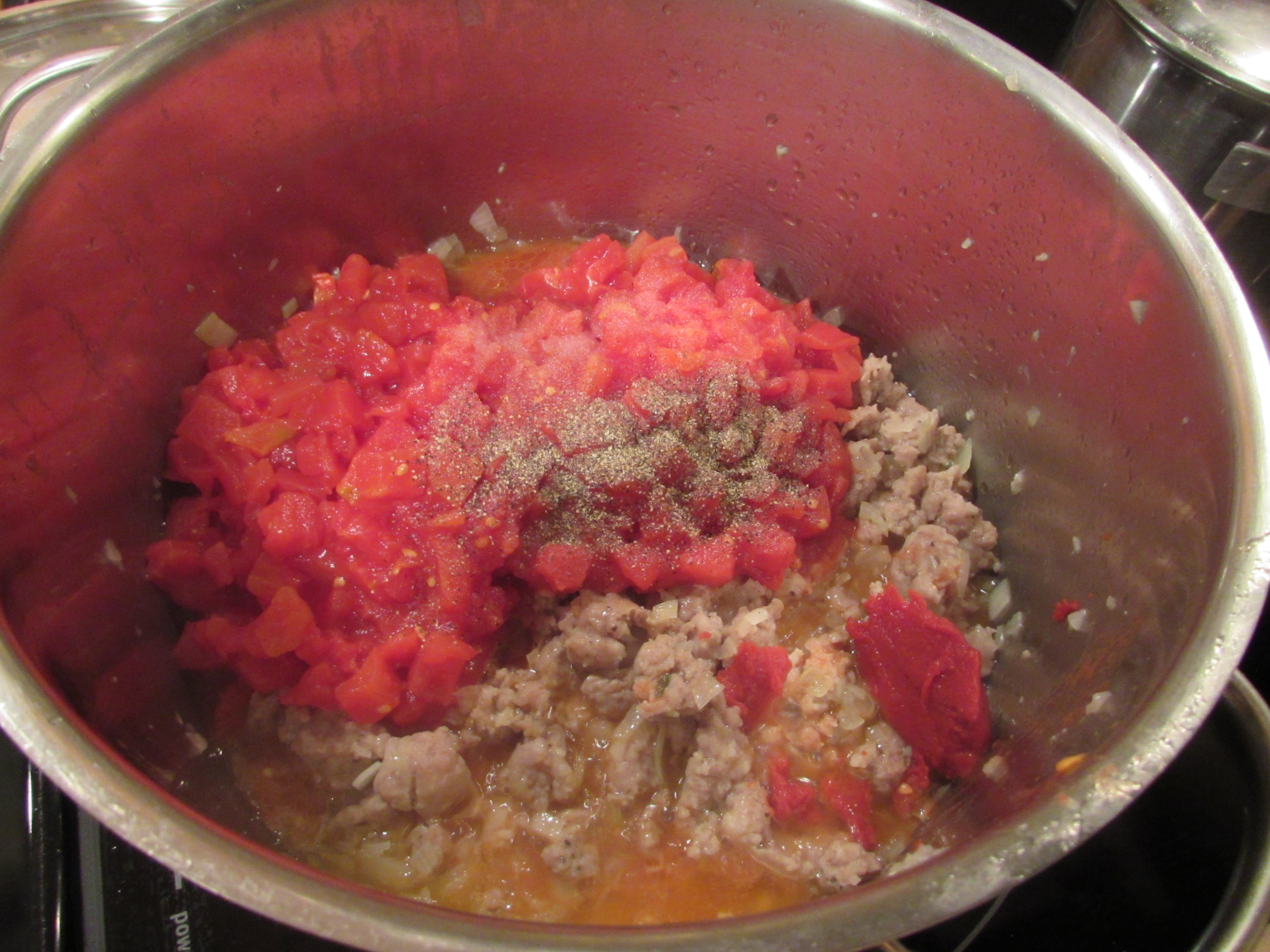 add paste, salt, pepper, tomatoes: