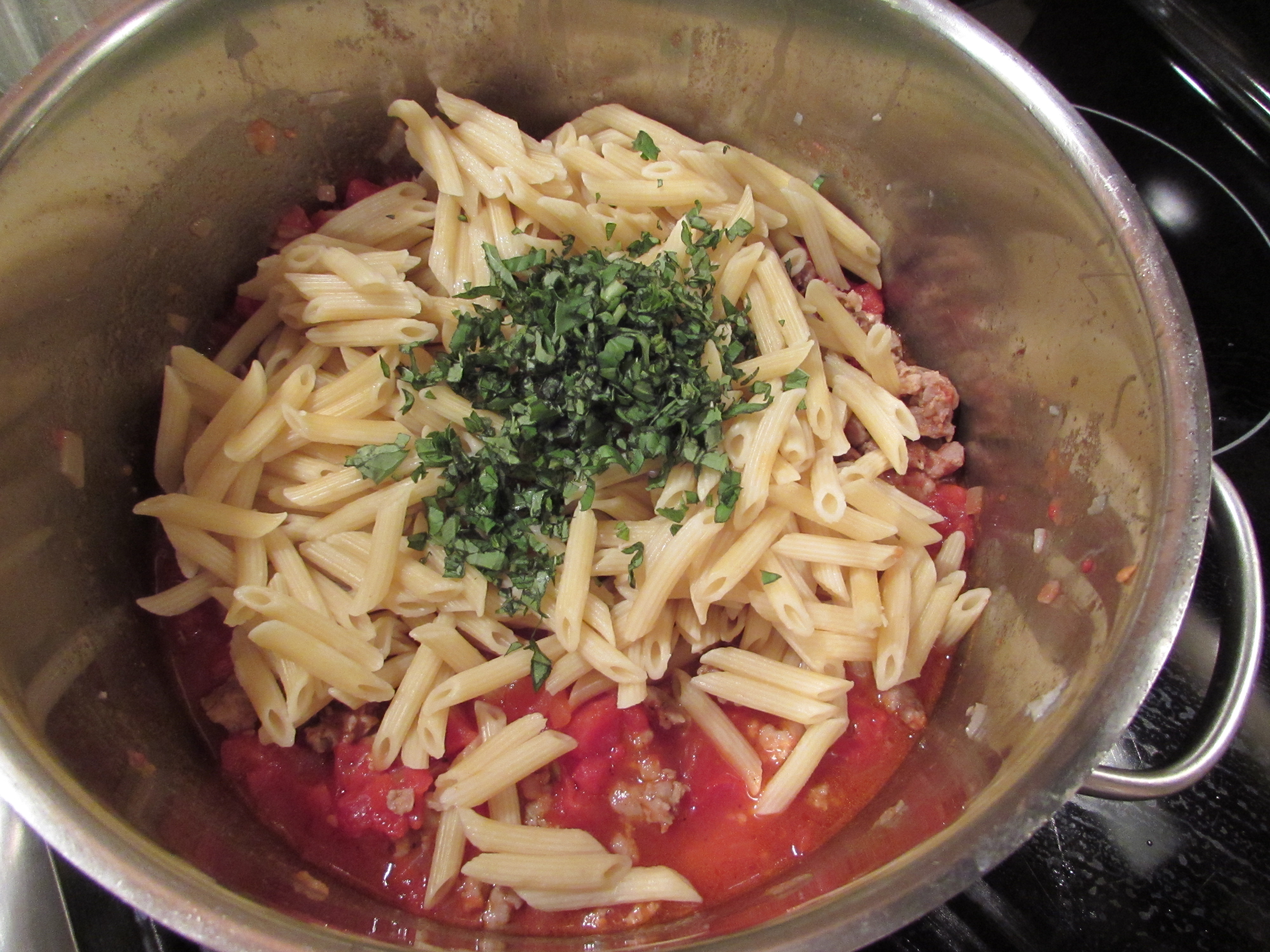Remove from heat and add pasta and basil to sausage mixture.