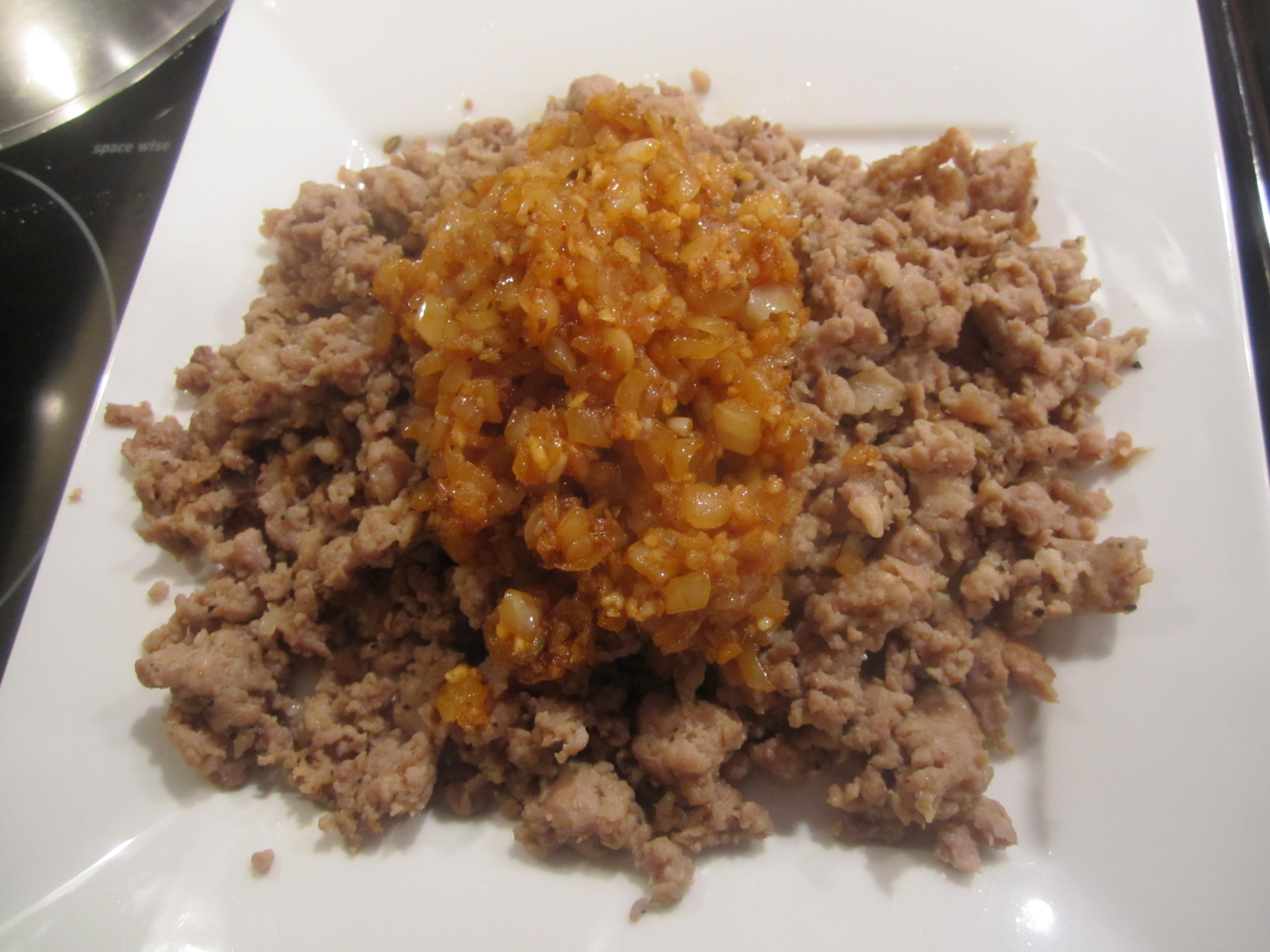 cooking onions,Essence, garlic and anise seeds, then add to sausage: