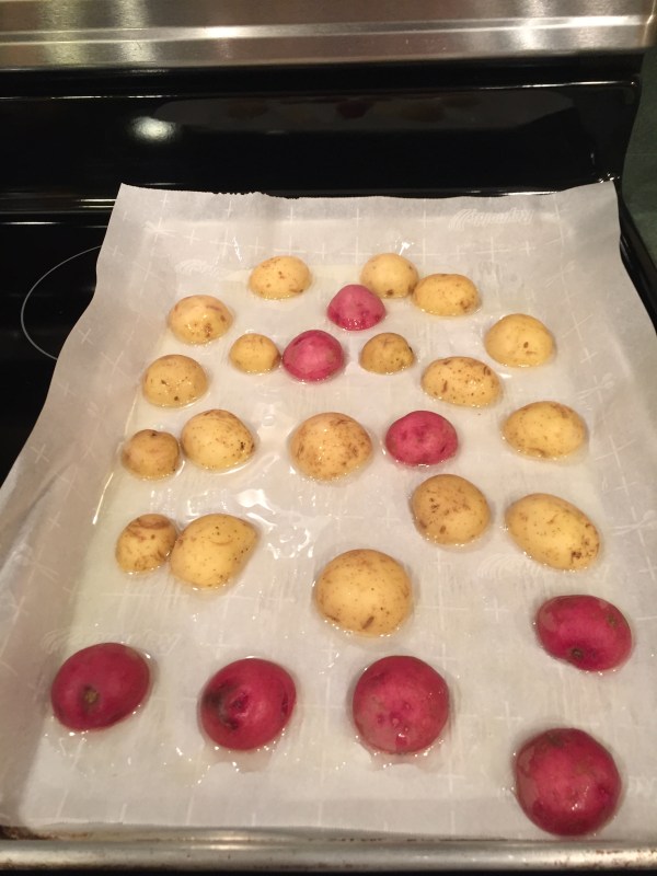 Tilt the cookie sheet back and forth to distribute the olive oil evenly on the pan. You may have to re-position the potatoes a bit so they are evenly spaced on the parchment.