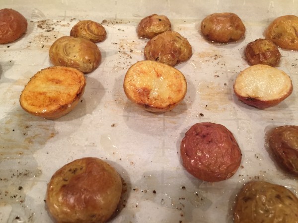 Yukon Gold potatoes are a must. They do not get overly soft inside when roasted. Try to get ones that are about 1-1/2 to 2 inches. If they are not exactly the same size that is ok, some will just be more crispier than the others.