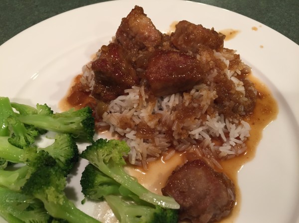 Serve over rice with brocolli or peas as a vegetable side. If making slaw, place on top of pork.