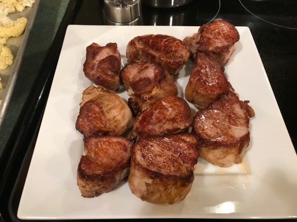 Cut meat into 1-1/2 inch slices (it will be rare). Put skillet back on burner and add 1 tablespoon of butter and 1 tablespoon of olive oil. Place pork slices, cut side down, into pan and brown on each side, about 2-3 minutes each side. Do not over cook. You may have to remove smaller pieces before.