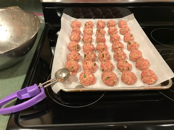 In a very large bowl, put the ingredients for the meatballs: onion through parsley. Mix thoroughly. Add ground lamb and with a large fork stir to combine. Mix until you see the other ingredients evenly dispersed in the lamb. Try not to mix too heavily or the meatballs will be dense and hard.