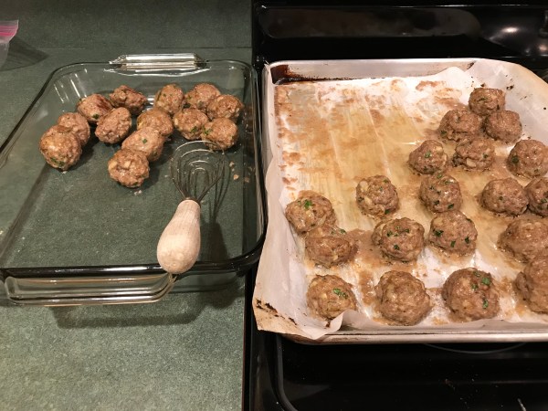 Place parchment paper onto a cookie baking sheet with sides. Form lamb mixture into 1-1/2 to 2 inch balls and place on prepared baking sheet. Cook in oven for 20 minutes.