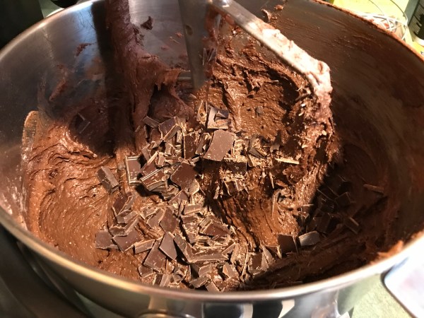 Add the flour mixture  and beat on low speed until almost combined.  Then add in the 1/2 chip size semi sweet chocolate and mix until just combined.  Cover and refrigerate for 1 hour.