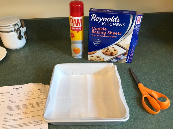 Spray or butter 9 x 9 inch baking pan with canola oil spray. Line with parchment paper (see picture below for a guide).