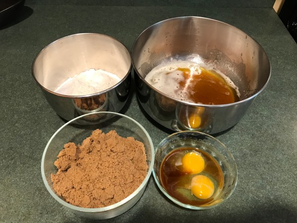 When the butter is cool (I usually measure out the other ingredients after I have browned the butter and by the time I am finished, the butter is cool enough), add the sugar and whisk until smooth (if you find this difficult (I do) use a hand held mixer to do the mixing). Add the eggs and vanilla and mix until well combined.