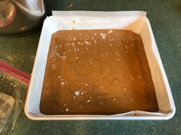 Pour batter into prepared pan, smooth the top and sprinkle with flaky salt, if desired.