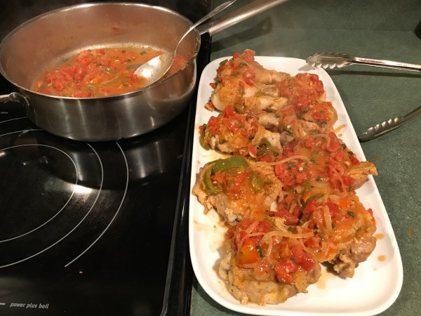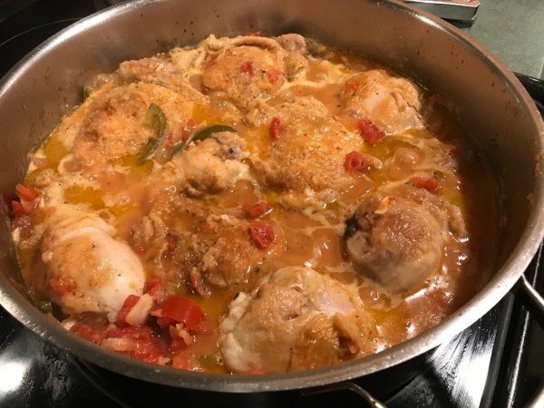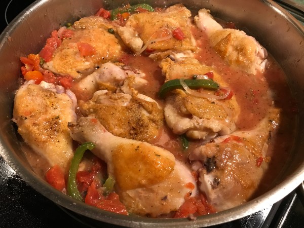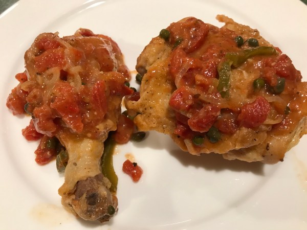Add the tomatoes with their juice, chicken broth, capers and oregano. Return the chicken pieces to the pan and turn them over to coat with the sauce. Bring the sauce to a simmer and cook on medium low heat until the chicken is cooked through, about 30 minutes. You can test with an instant thermometer, it should register 160 degrees or higher.