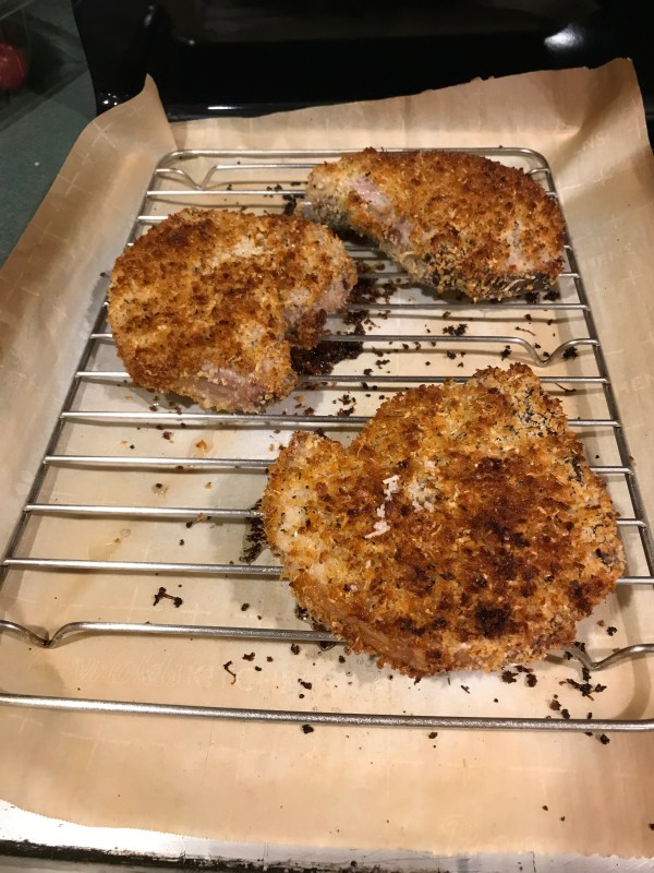 Bake pork chops until the breadcrumbs are dark golden and the internal temperature of the chops registers 165 degrees on an instant read thermometer, about 30 minutes.