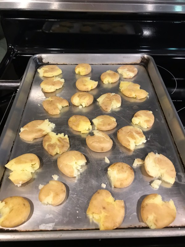 Smash the potatoes, using a heavy mallet (see picture below) or Tieghan suggests taking another rimmed cookie sheet, place on top of potatoes and pushing down to smash the potatoes. Or she also suggests using the bottom of a mug. Whatever works for you.
