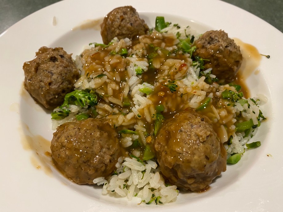 Mushroom and Pork Meatballs with Broccolini Rice