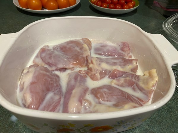 Place the chicken in a container with a lid, big enough for approximately four pieces of thighs. Mix buttermilk and salt in a bowl and pour over chicken. Refrigerate for at least 20 minutes. (Tieghan also says overnight but I never remember to do things the night before).