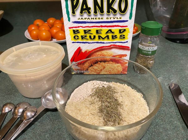Place Panko, whole wheat flour, thyme and salt in large, flat container. Stir together.