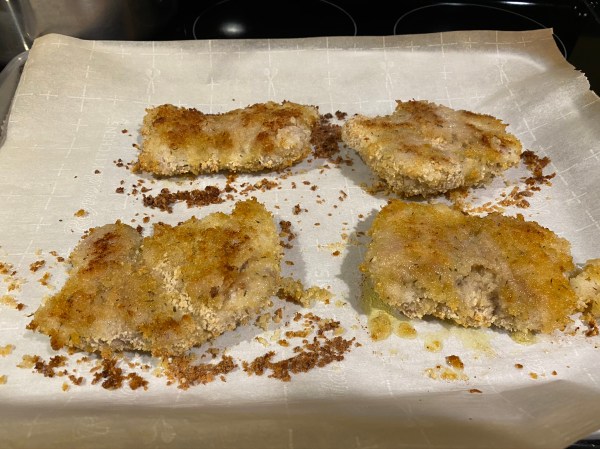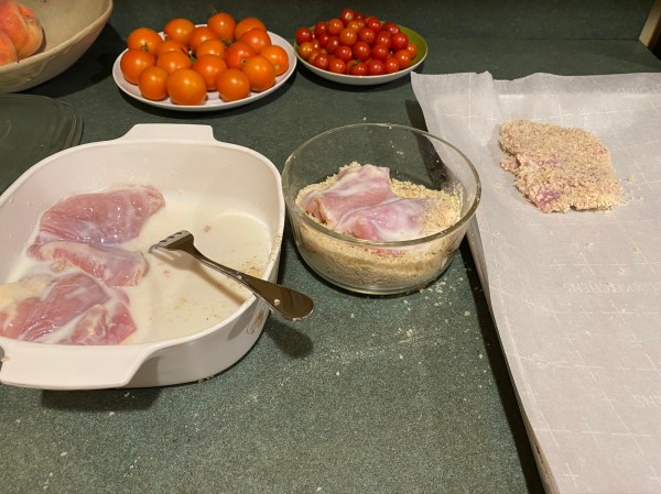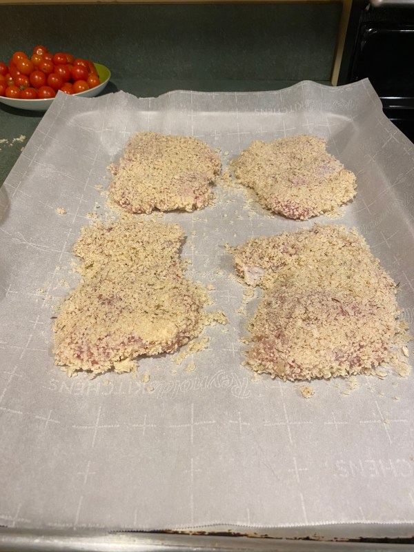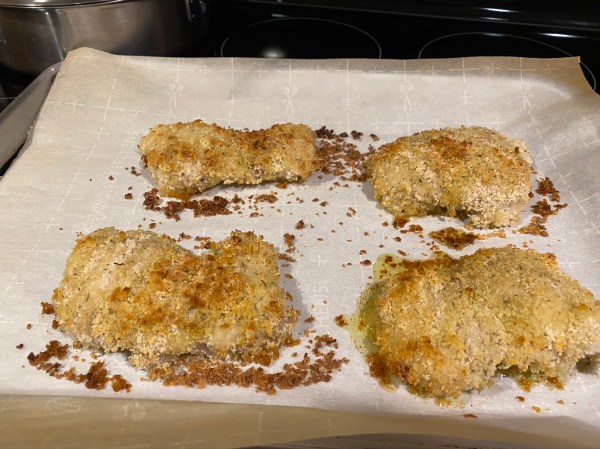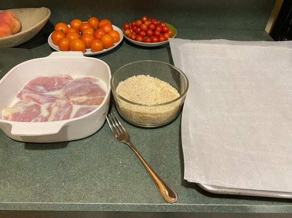 Remove one piece of chicken from buttermilk mixture and dredge with the Panko crumbs, pressing gently to adhere. Place on the prepared rimmed baking sheet. Continue with the rest of the chicken.