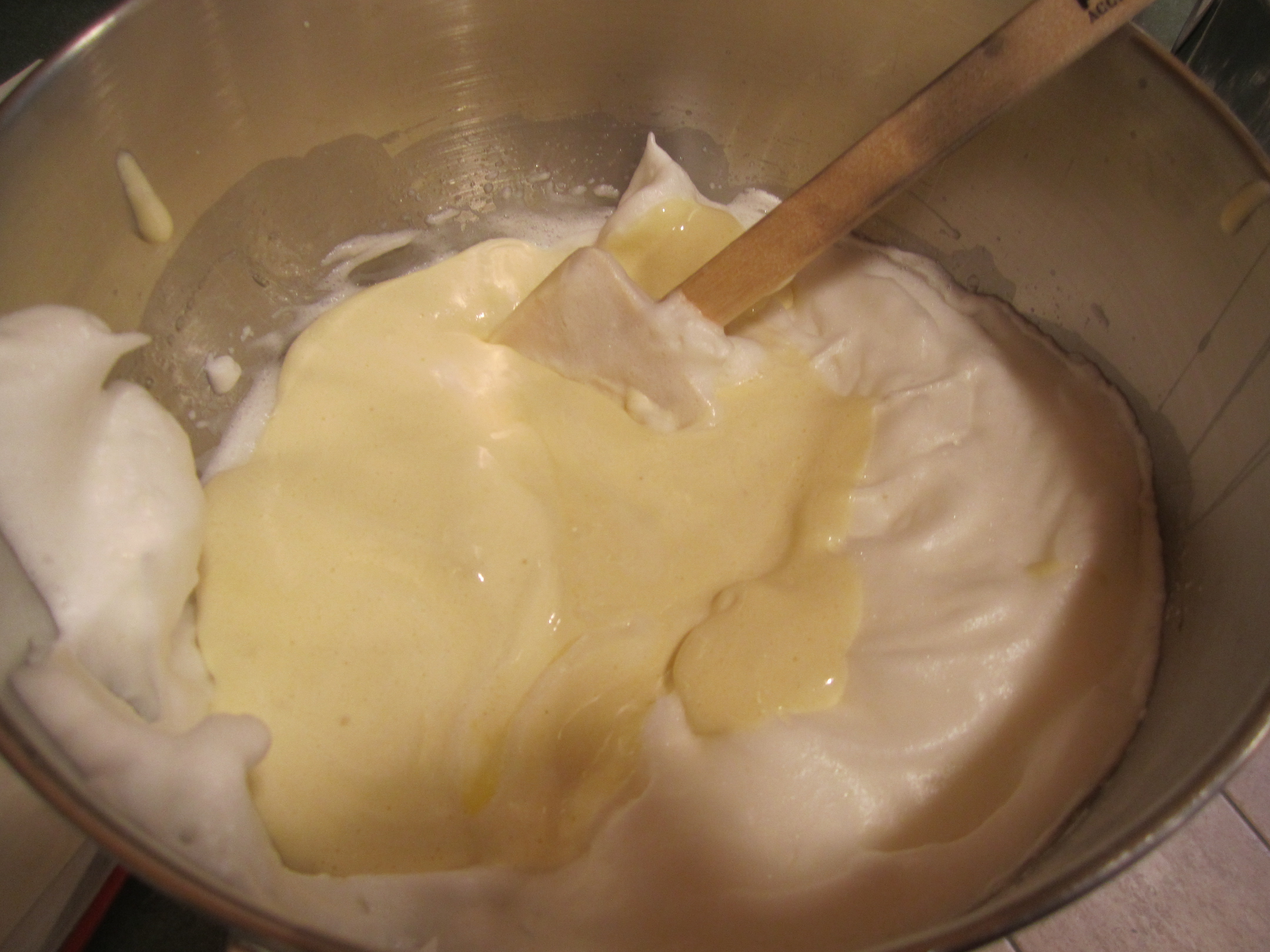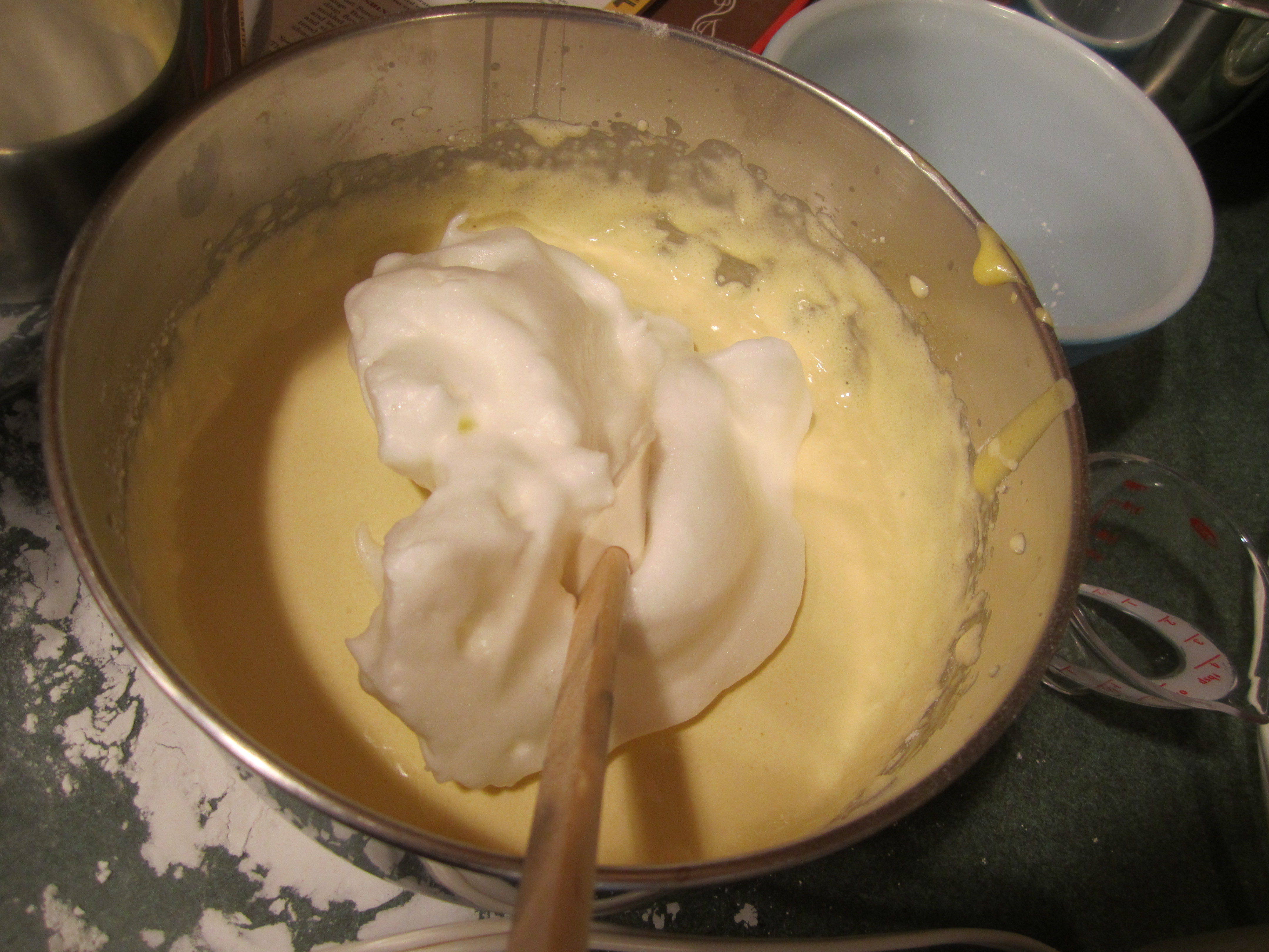 Carefully sprinkle the flour, a little bit at a time, into the egg mixture while whisking constantly or almost constantly. This assures that you will not have any lumps in the batter. My mom used Wondra Flour when she made it. But if you are careful about adding the flour, you will be fine with just the regular stuff.